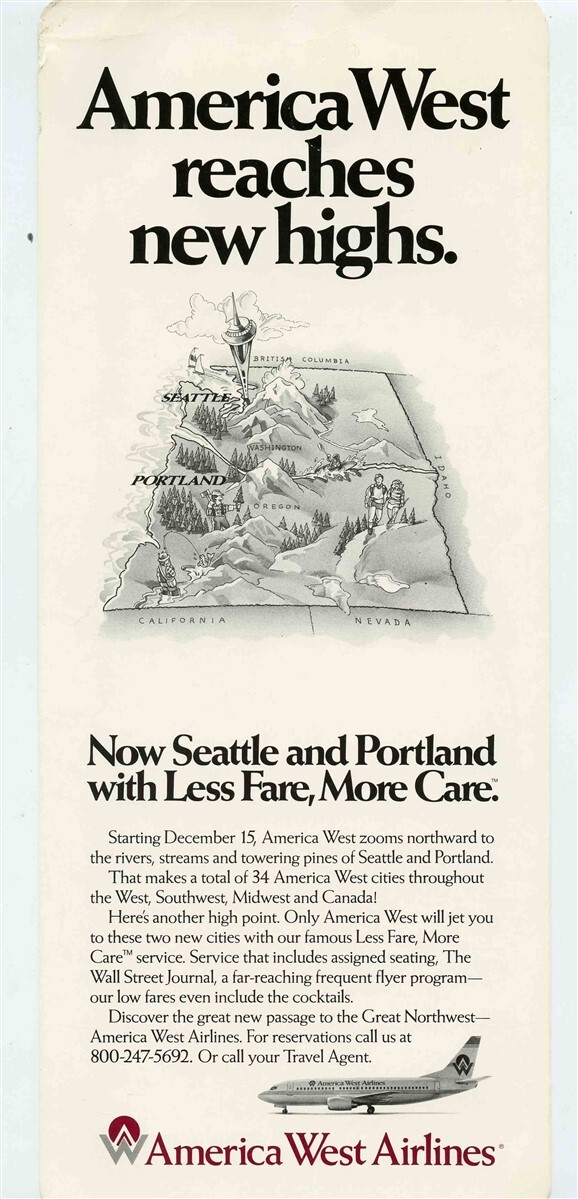 A very large 2 sided card from America West Airlines. On one side is Catch Our Nonstop Nite Flite to Las Vegas from 18 Lucky Cities with Route Map of those 18 Cities. On the other side is America West Reaches New Highs with information on New Flights to Seattle and Portland. Card measures about 5" x 12". Dated 1986