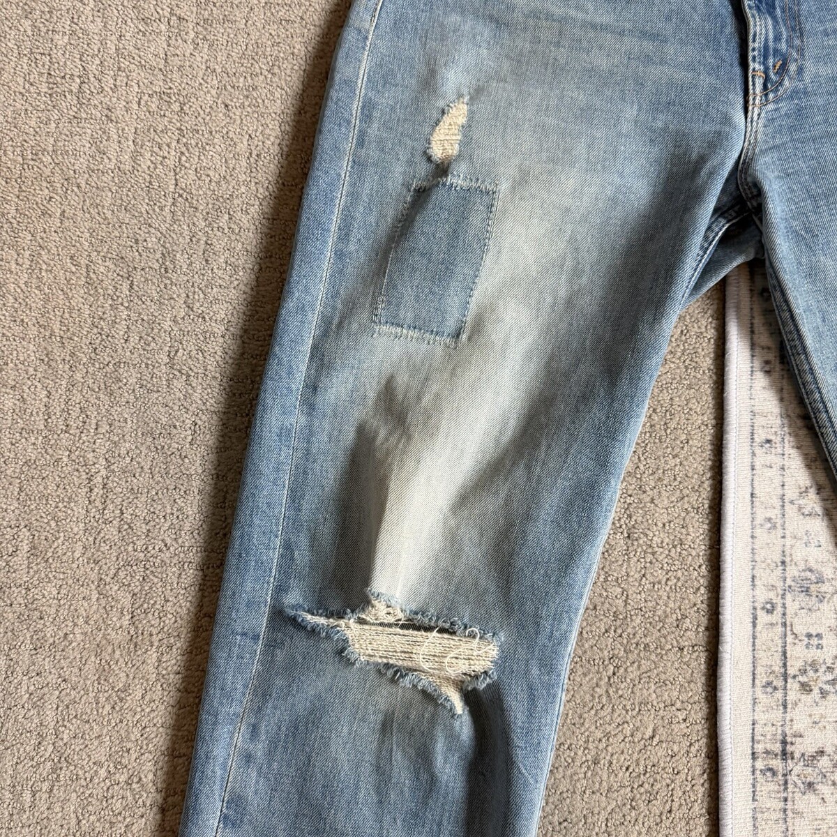 Good used condition, normal light wear. No stains. Factory distressing and holes, and patches. Please use zoom function to see complete details