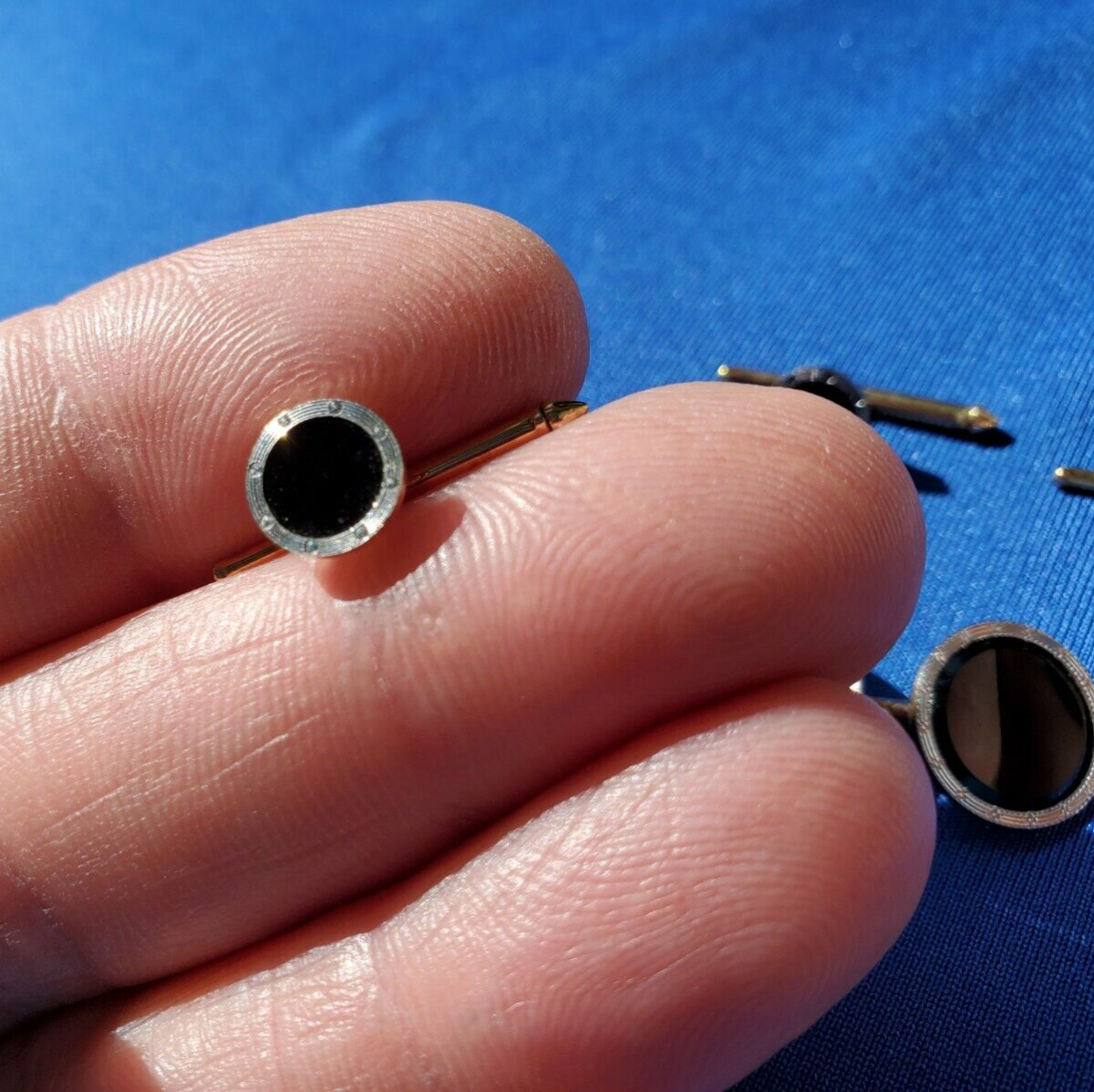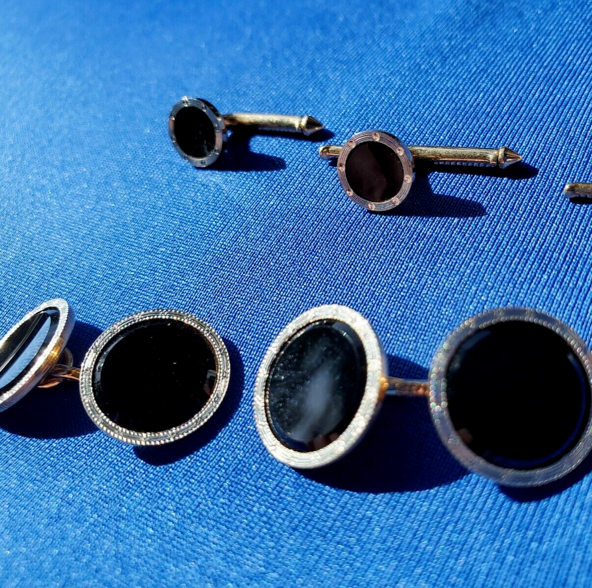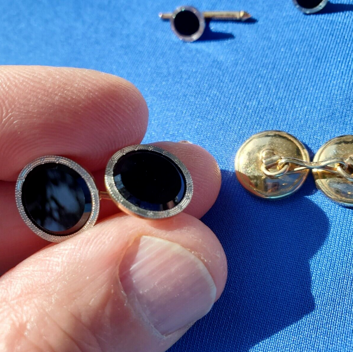 ORIGINAL ART DECO 14K GOLD AND PLATINUM INLAY ONYX BUTTONS.