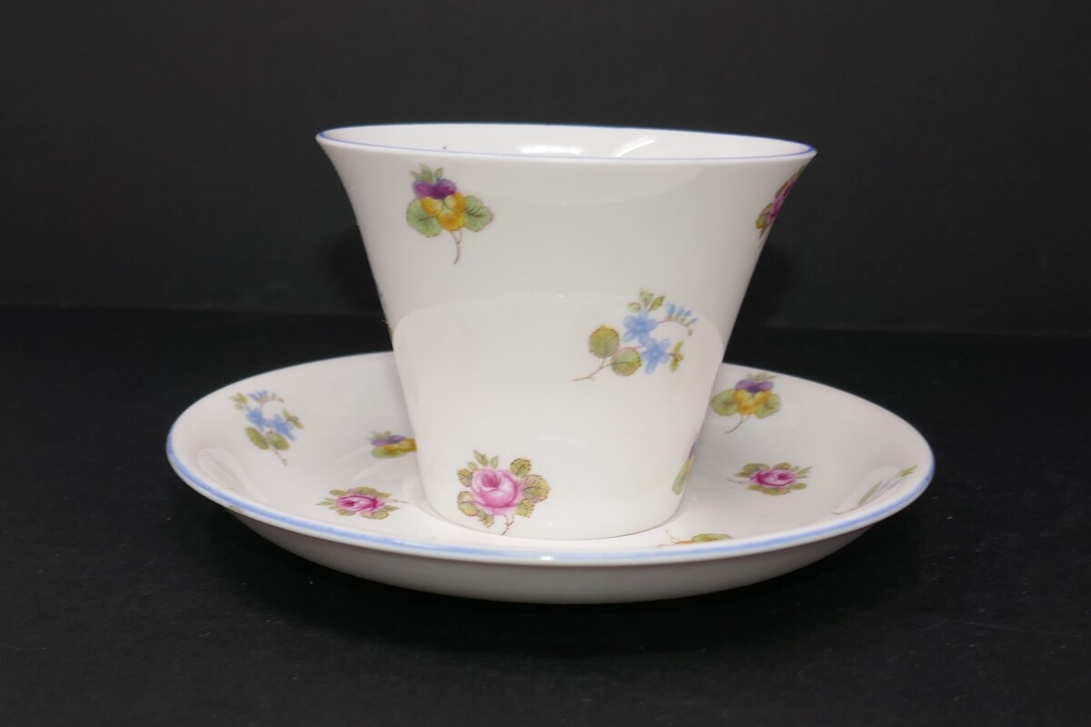 This vintage Shelley fine bone china cup and saucer set from England features a charming rose, pansy, and forget-me-not pattern, making it a decorative and unique addition to any collection. The cup is approx. 2.75" tall and the saucer is 5.5" wide with no chips, cracks or repairs. The round shape and glossy finish add to the elegance of the floral theme, while the two-piece set includes a saucer and espresso/demitasse cup, perfect for all occasions. This signed set is a true test of craftsmanship and a lovely representation of British pottery artistry.