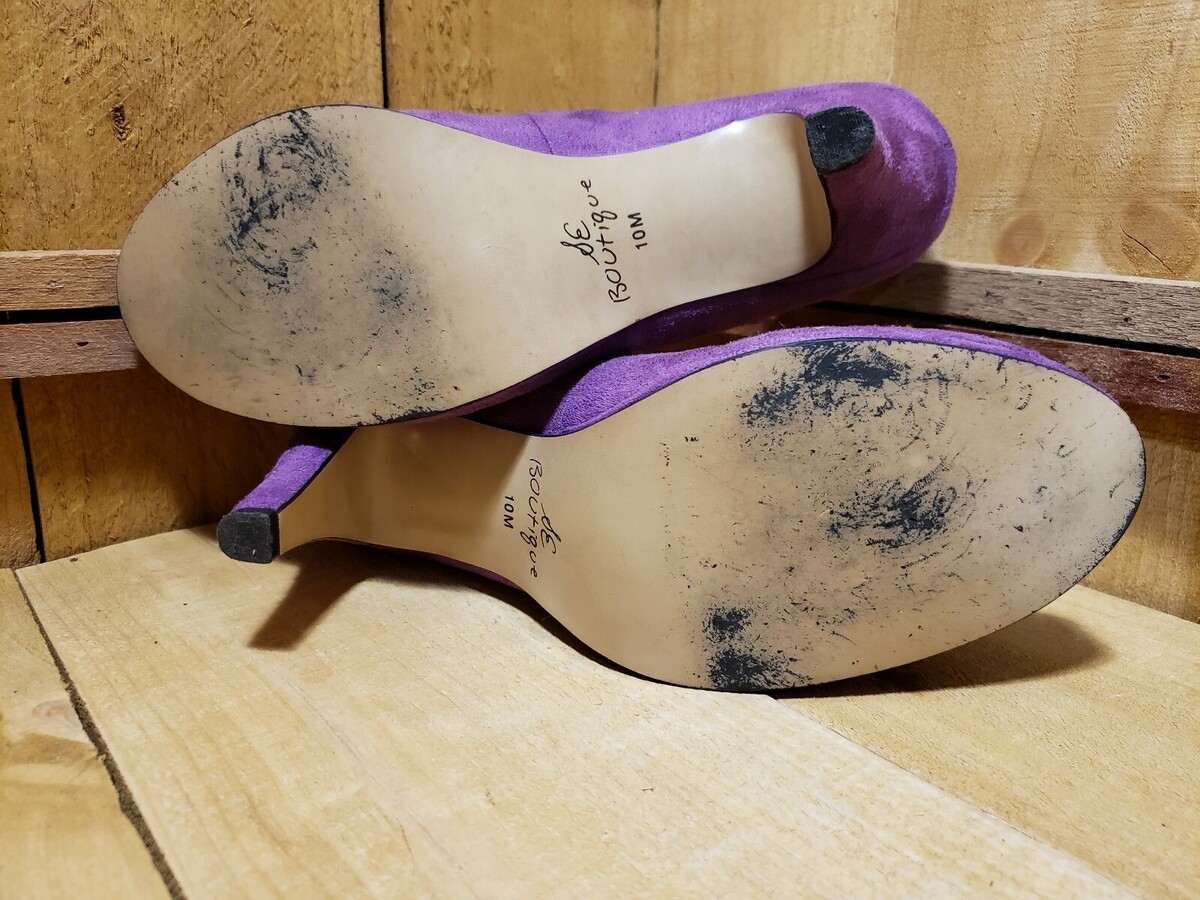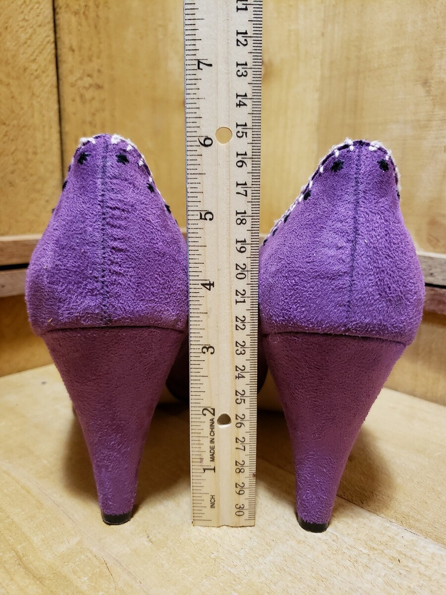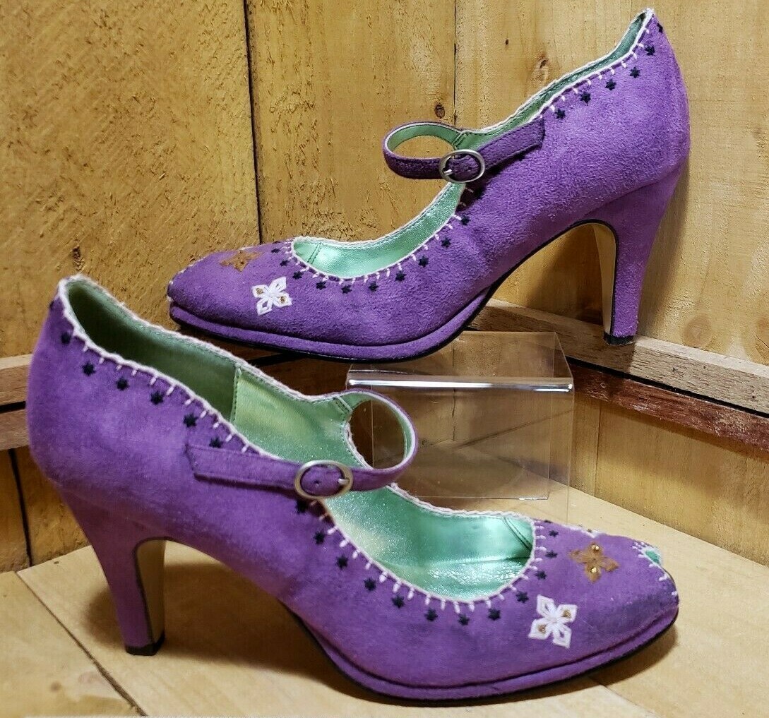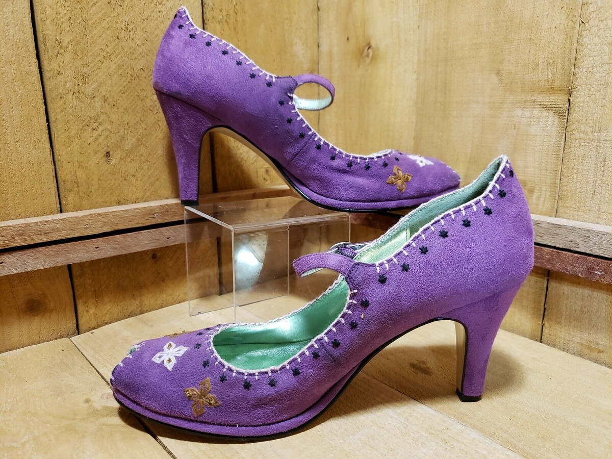 Purple Faux Suede Peep Toe, Mary Jane, Embroidered, Heel