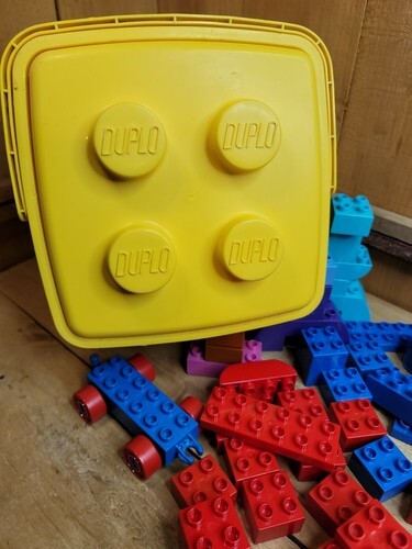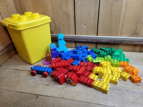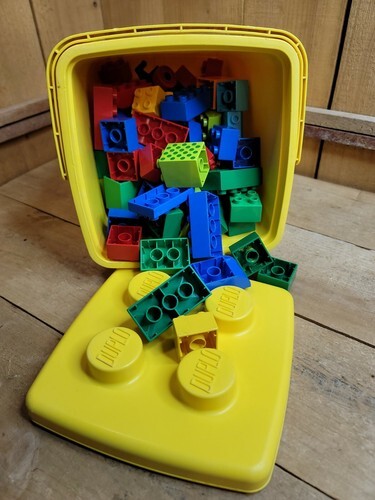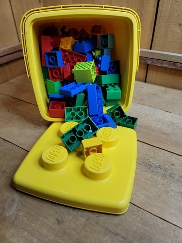 LEGO DUPLO Vintage Lot of 88 Bricks Pieces Parts Plus Yellow Bucket Case Age 2-5