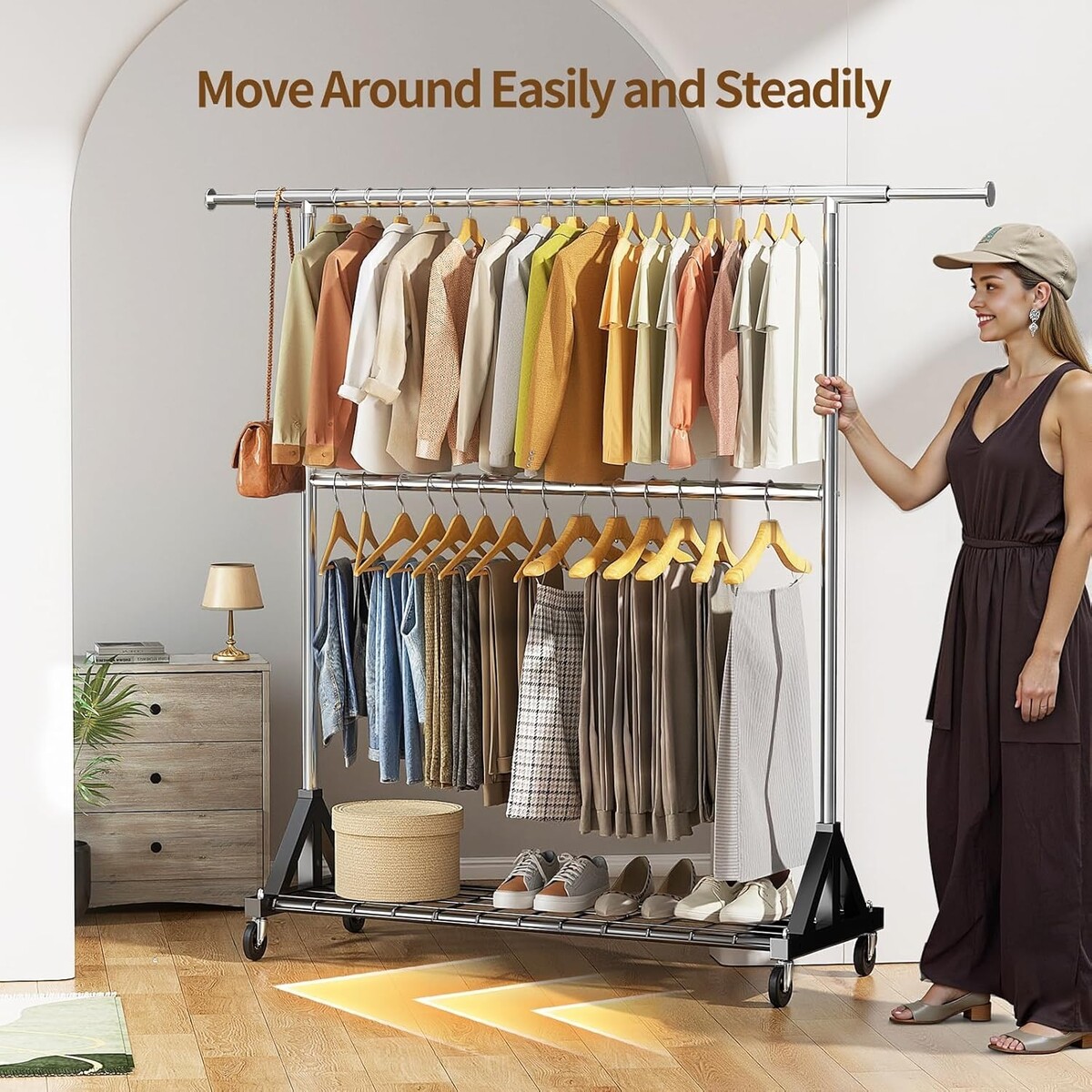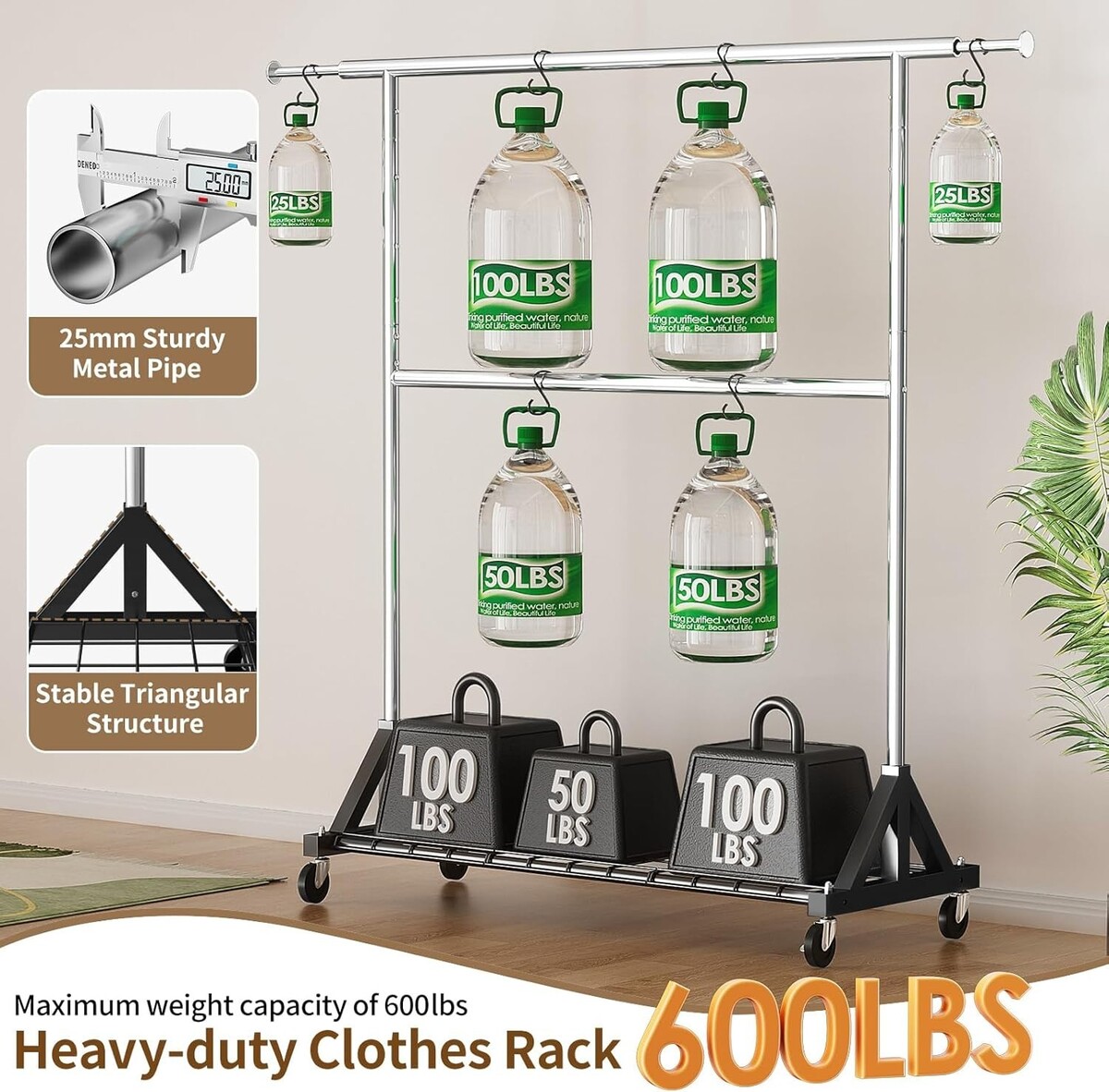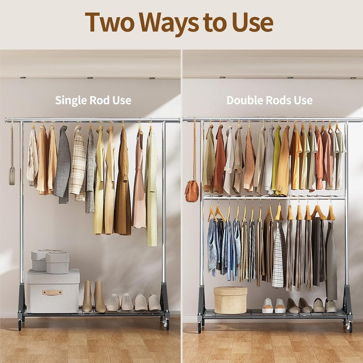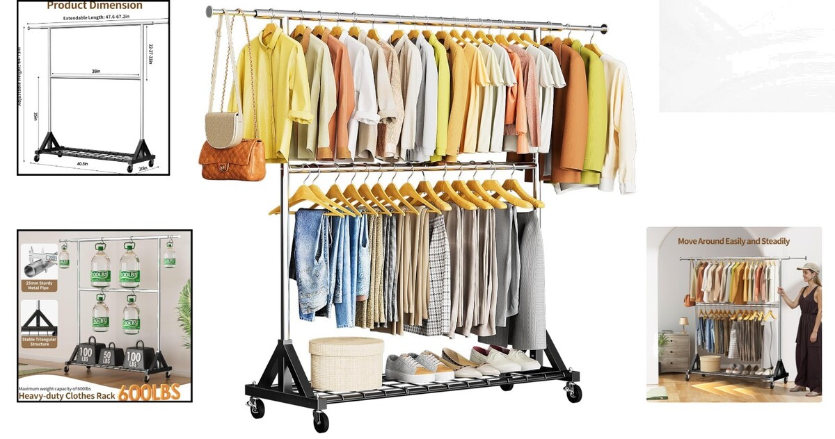 Heavy Duty Clothes Rack with Double Rod & 600 LBS Capacity - Adjustable & Mobile