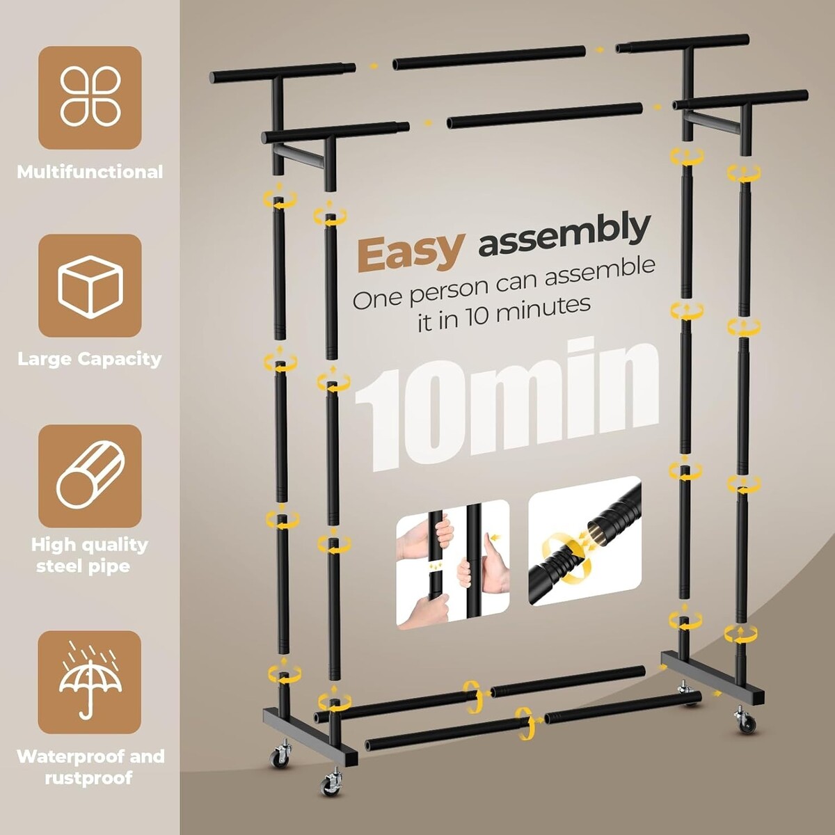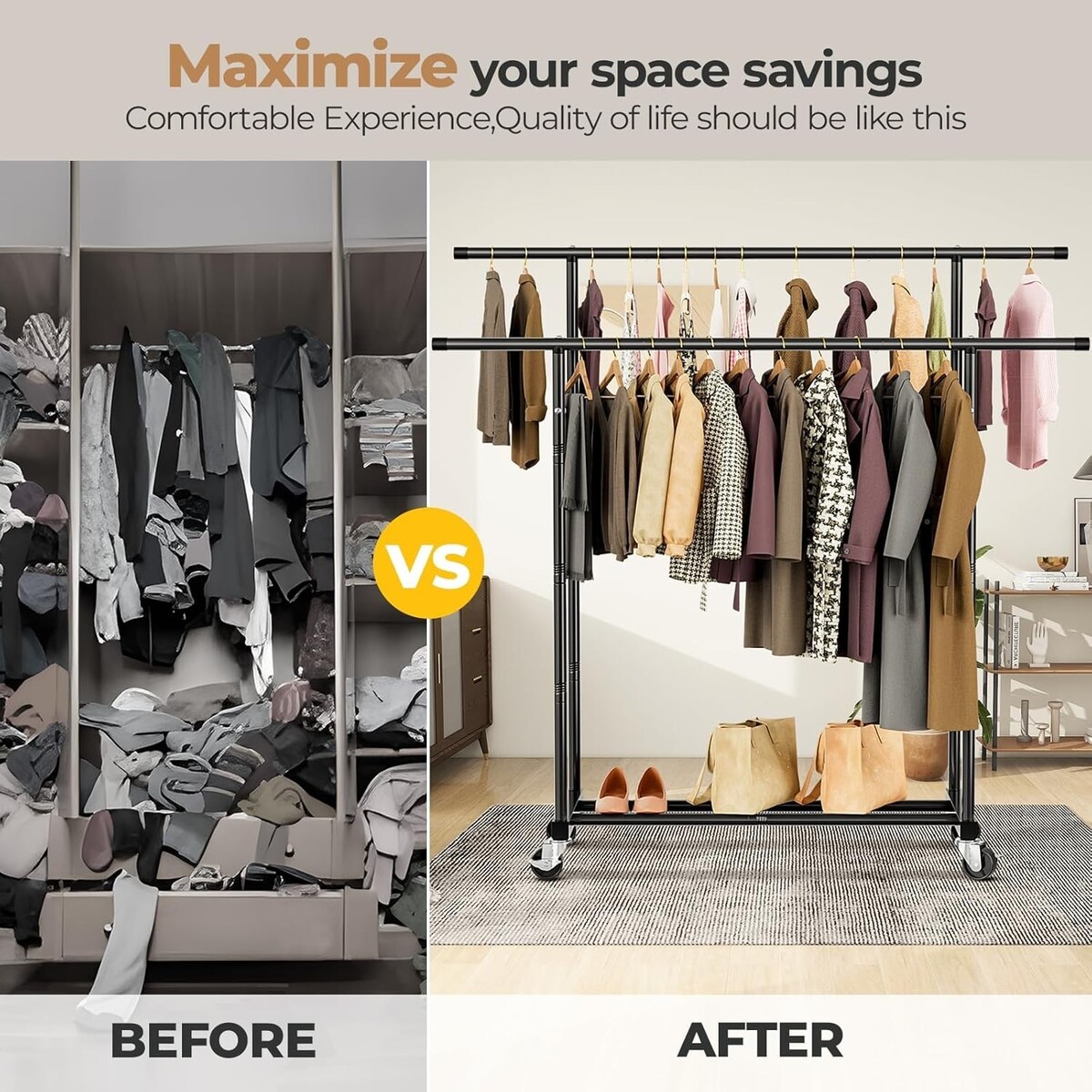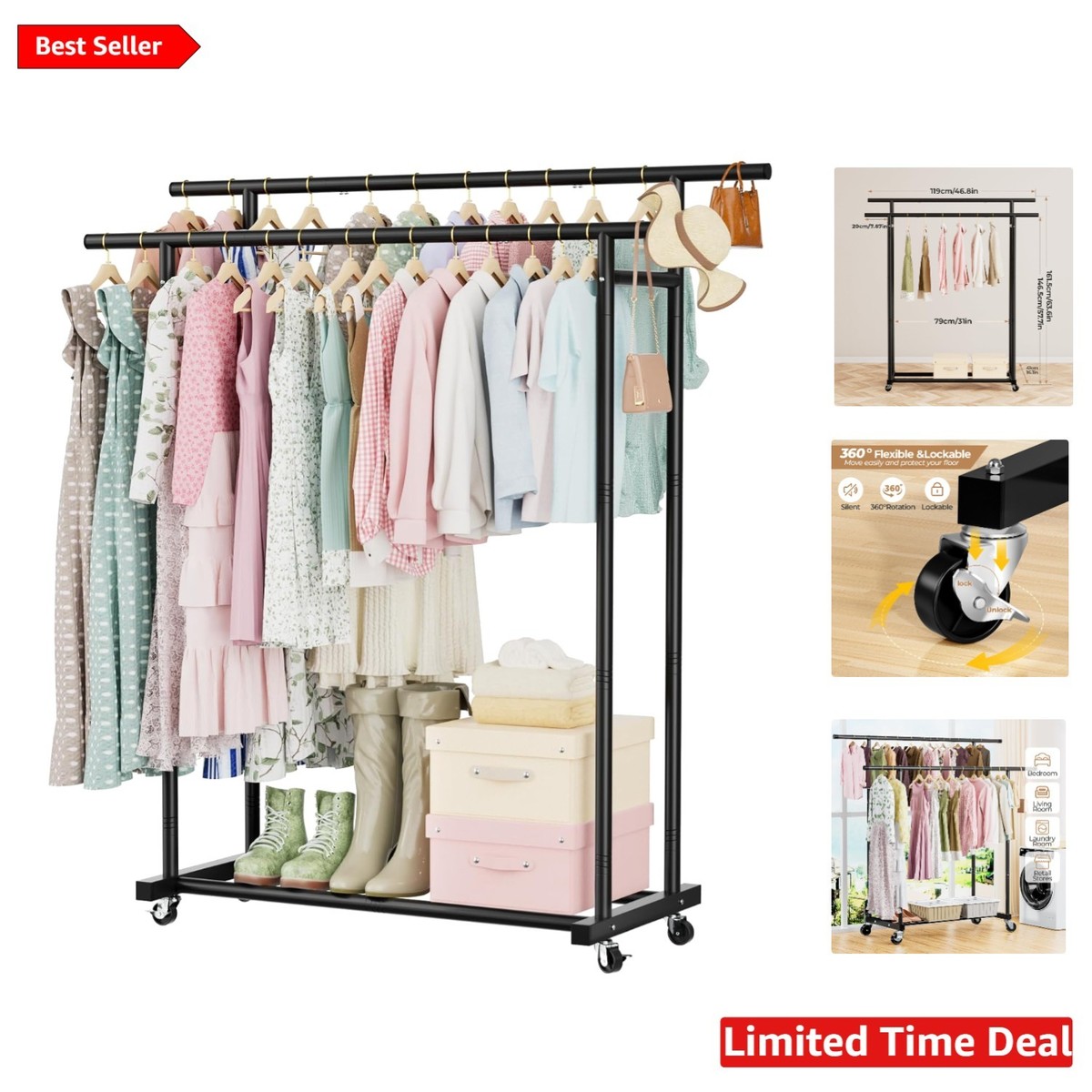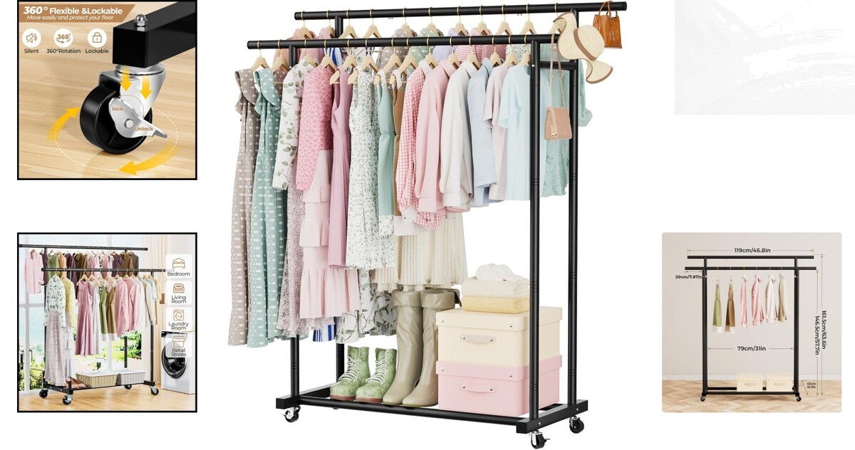 Elegant Black Double Rods Clothing Rack with Lockable Wheels, 200 lbs Capacity