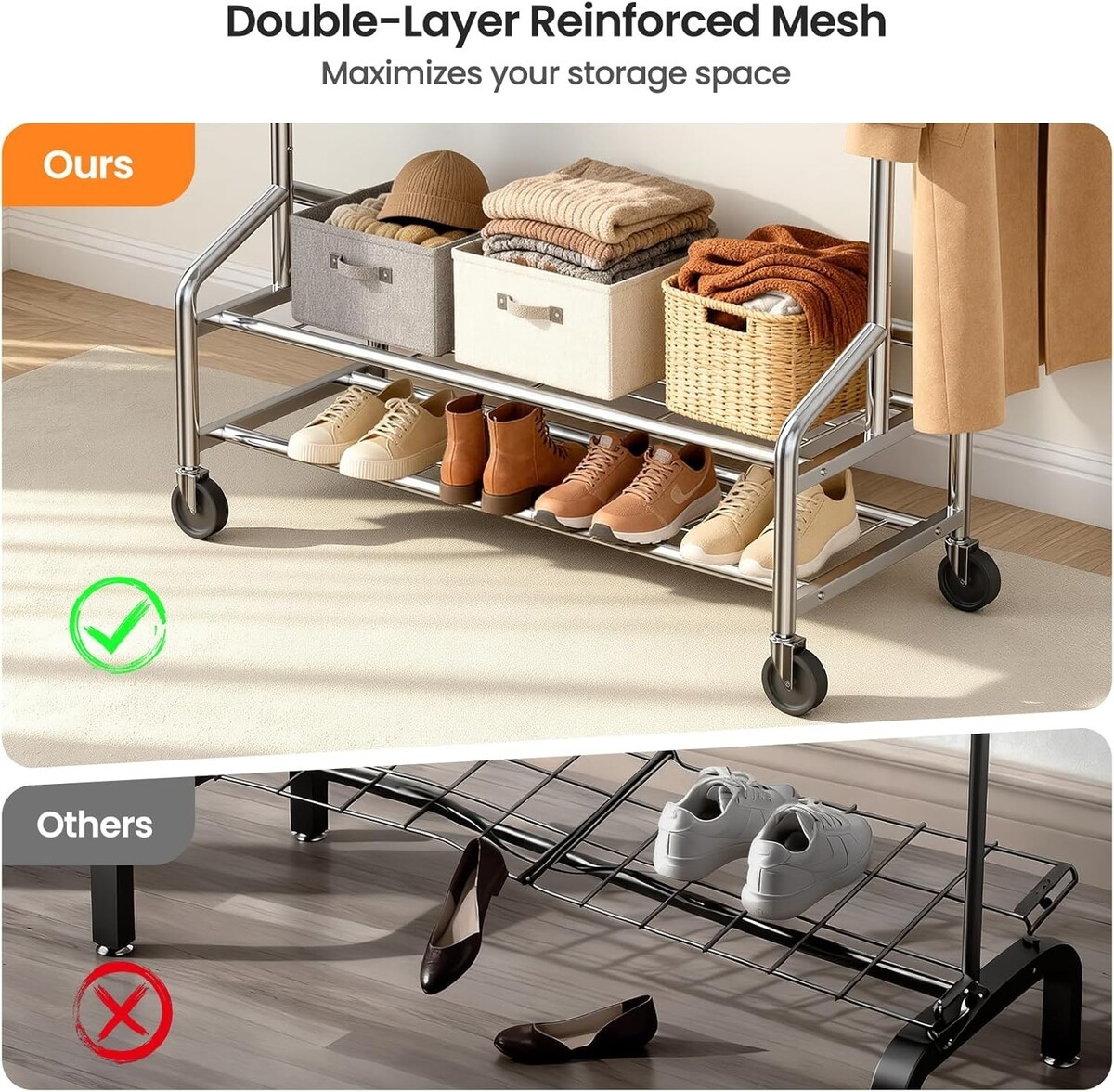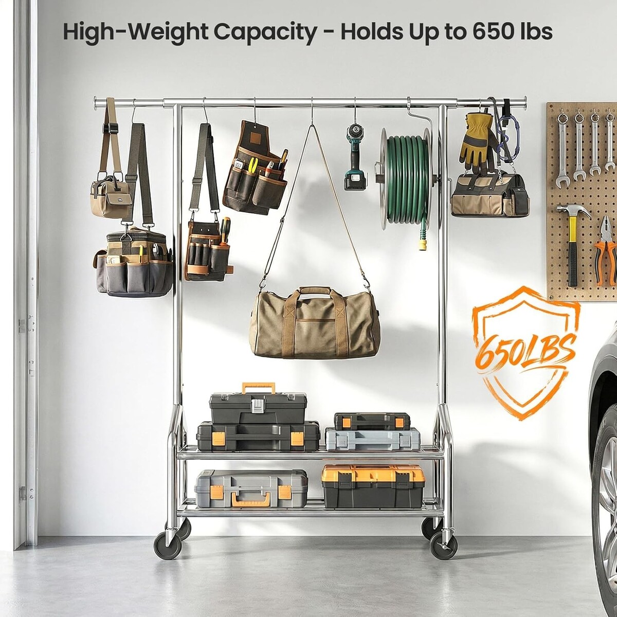 Heavy Duty 650 lb Capacity Rolling Clothes Rack with 2 Shelves - Silver Elegance