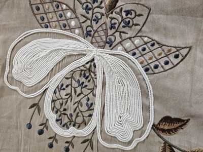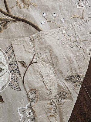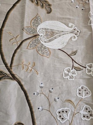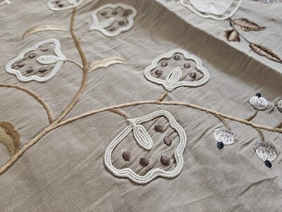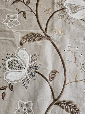 Flowers have long been a source of inspiration for fabrics, and have been depicted in many shapes forms throughout history. Here is an example in a large scale Indienne design. Hand and machine embroidered, the trailing branches dotted with imaginary flowers contrast with the silk viscose ground. Craft embroidery. No side matching