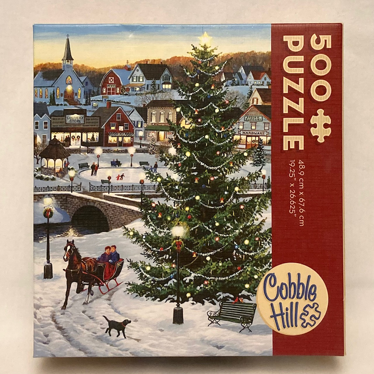 From Cobble Hill, this is a beautiful holiday jigsaw puzzle called "Village Tree". The artwork is by Persis Clayton Weirs, who is acclaimed for her work as a wildlife painter. This scene features a snowy village with a charming Christmas tree in the foreground with a horse-drawn sleigh passing by.