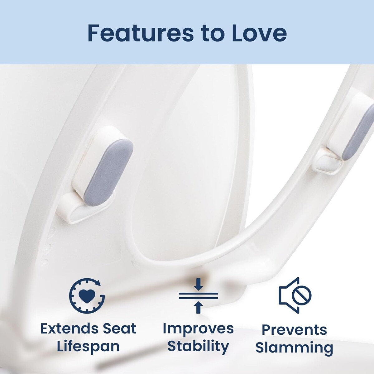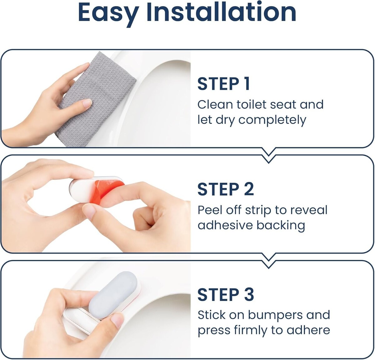COMPATIBLE WITH ALL SEATS: These bumpers easily attach to any type of toilet seat, equipped with durable adhesive pads that have been quality tested for strength.