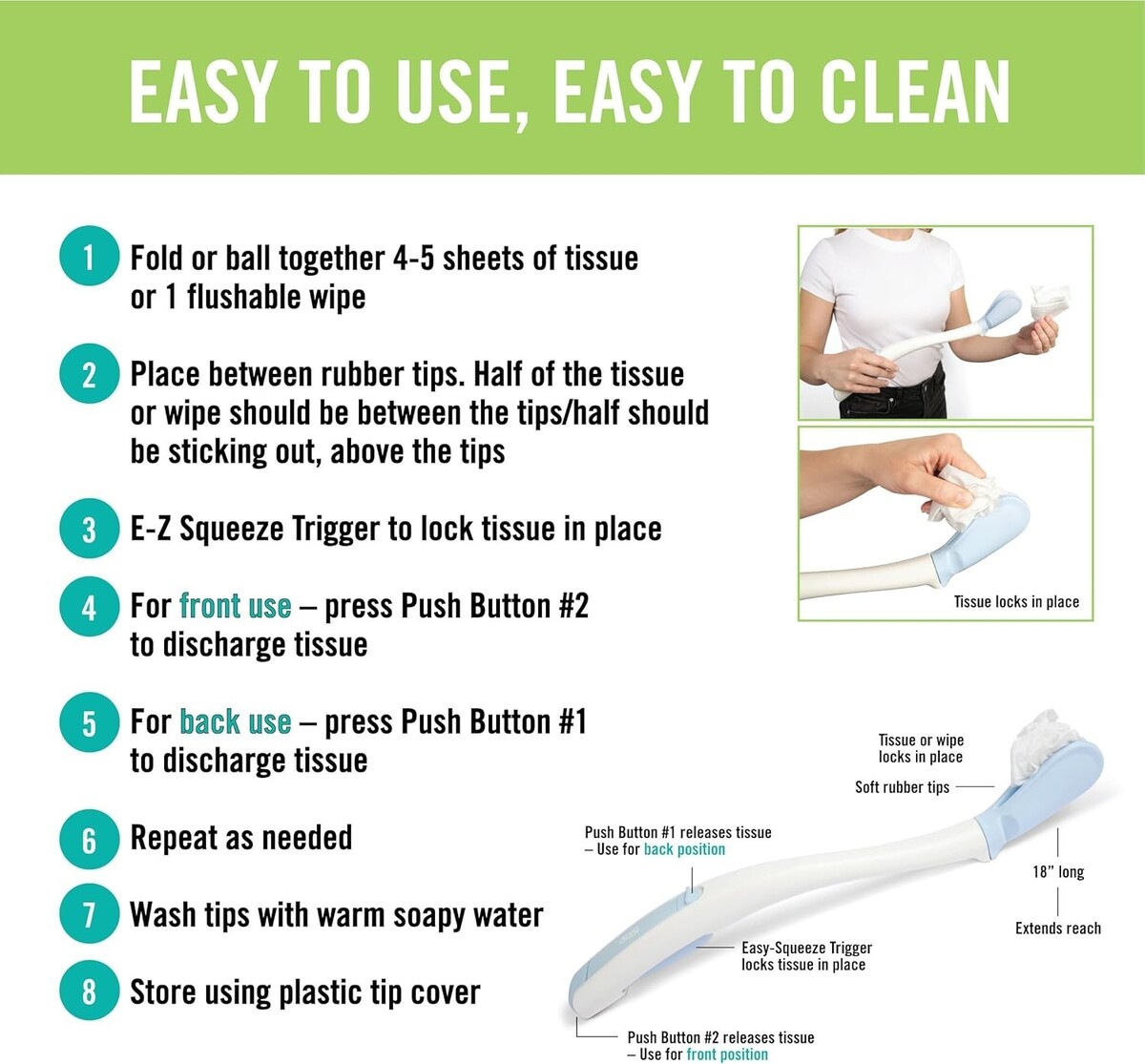 Easy Squeeze Trigger: Locks tissue or wipes securely between soft rubberized tips, releasing safety and comfort at the push of a button.