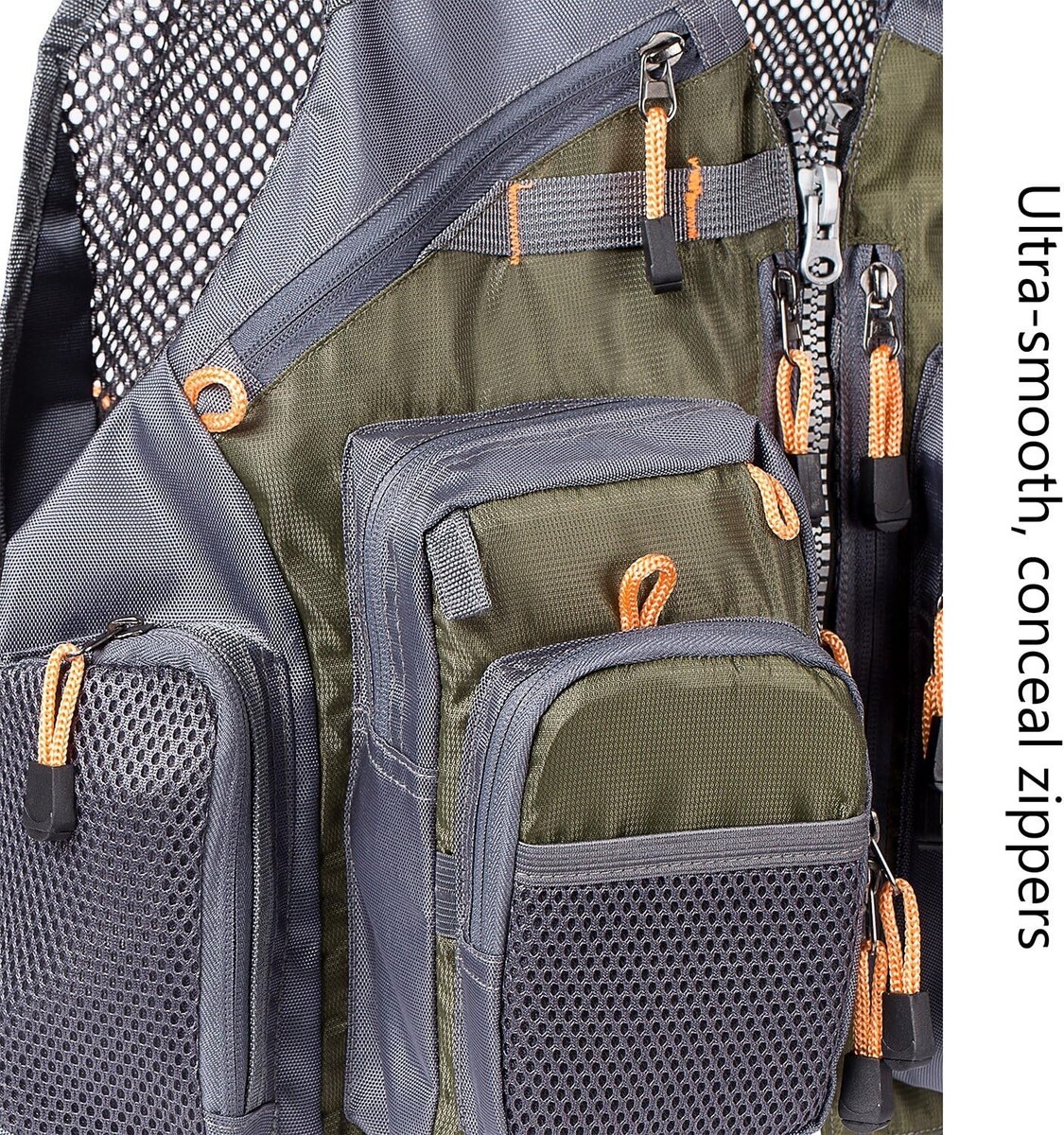 18 Functional Pockets: A comprehensive array of 18 pockets, including 14 zippered pockets with smooth conceal zippers, designed for function - perfect for everything from fly boxes to thermometers, ensuring you have what you need at your fingertips.