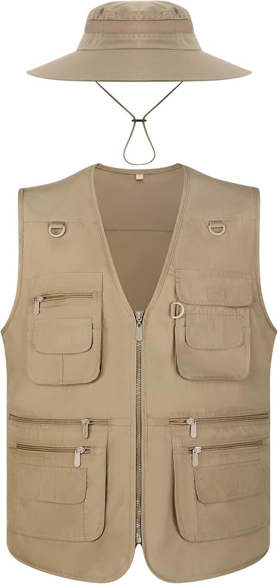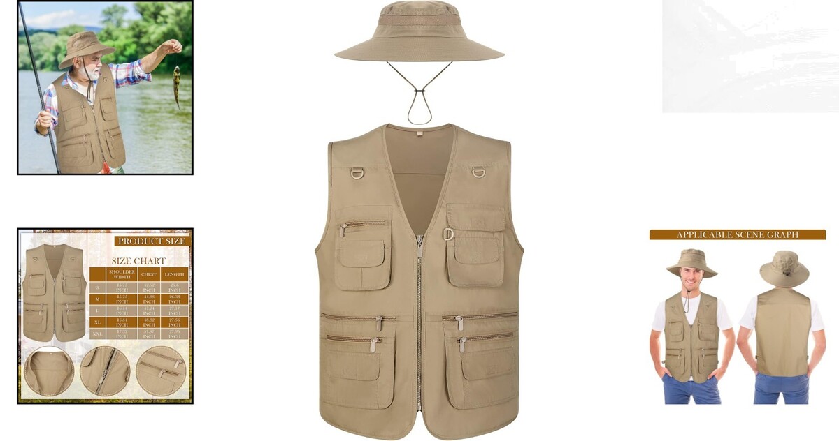 Men's Lightweight Fishing Vest Hat Set - 4 Pockets, UV Protection, Dark Khaki
