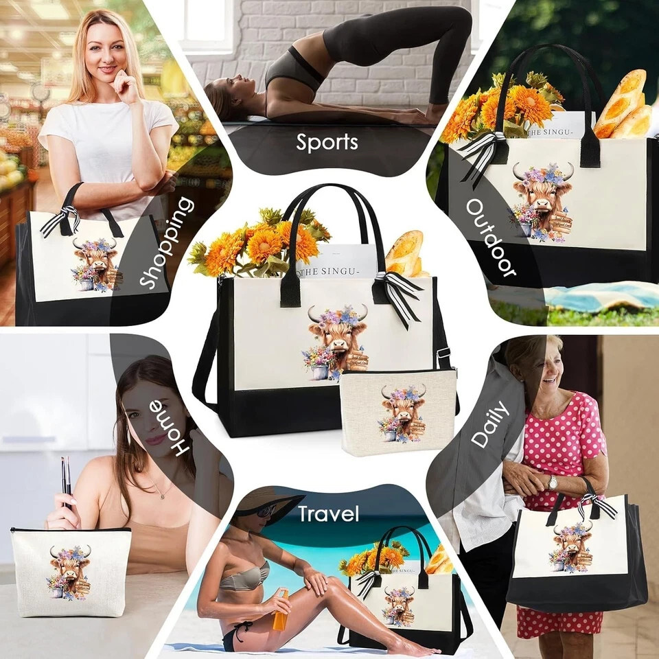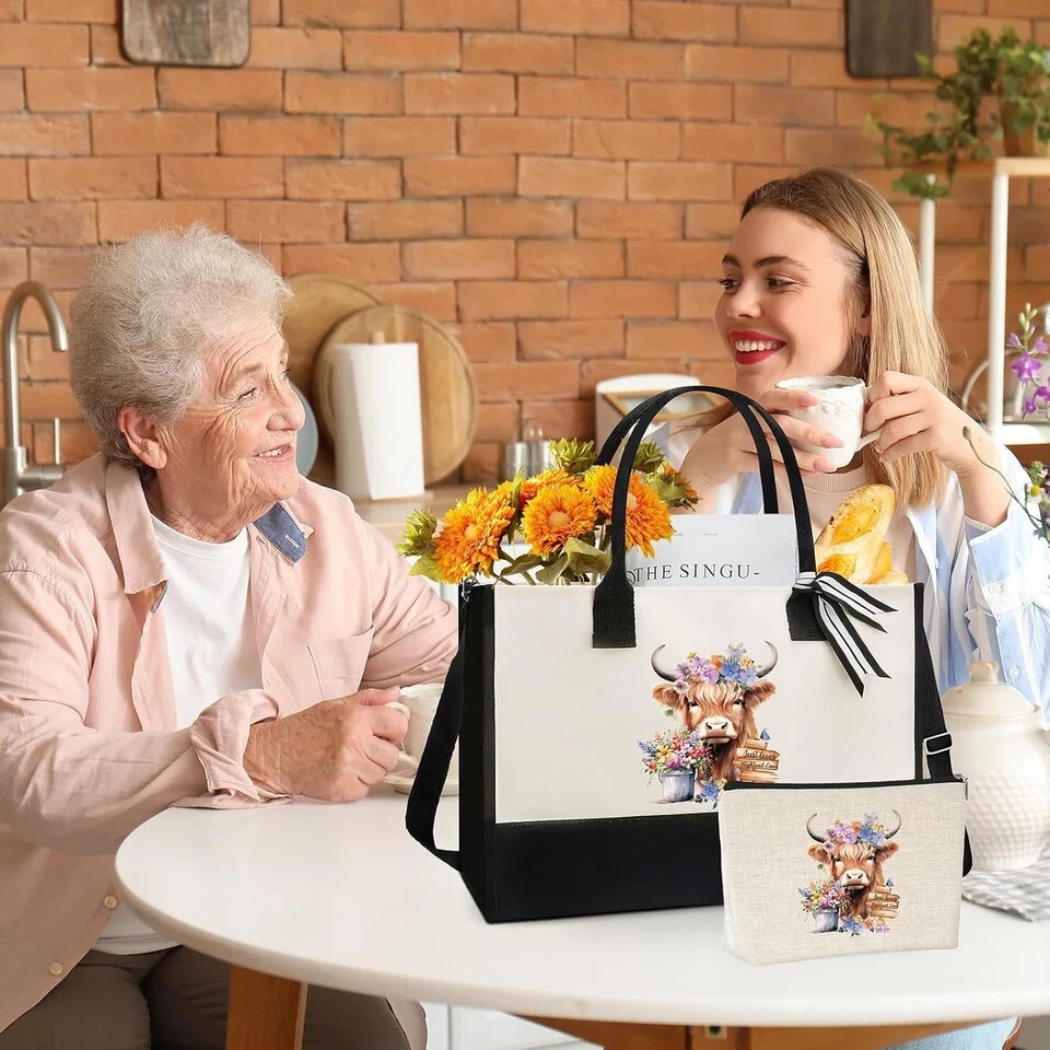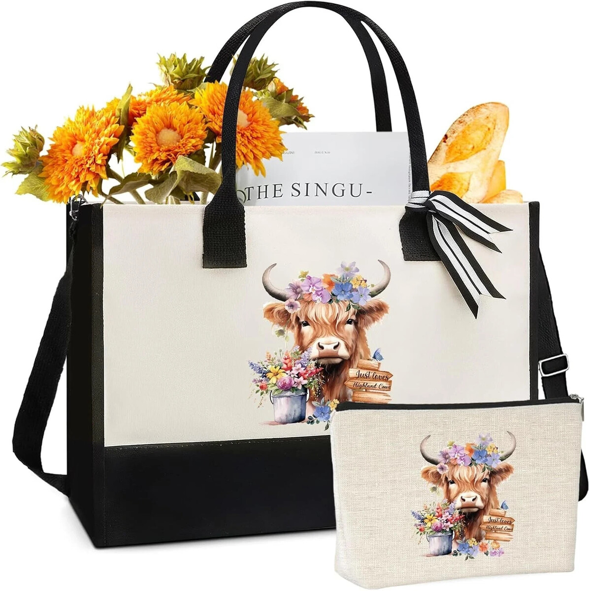 2-Set Highland Cow Tote & Makeup Bag Sunflower Canvas Gift for Women & Moms