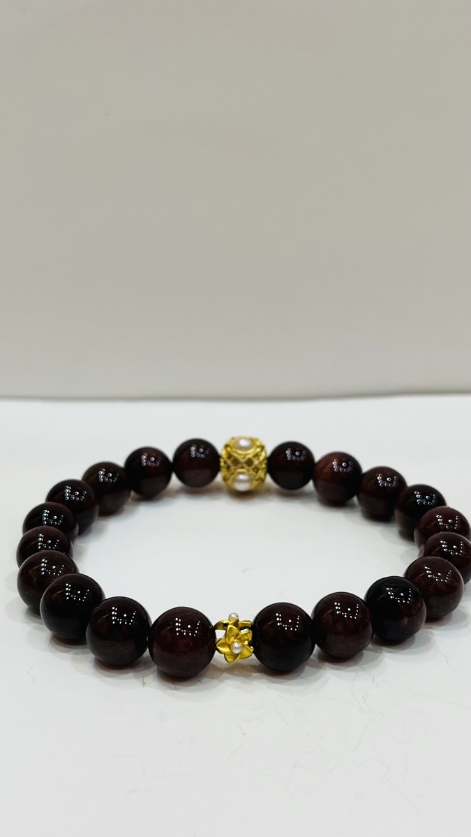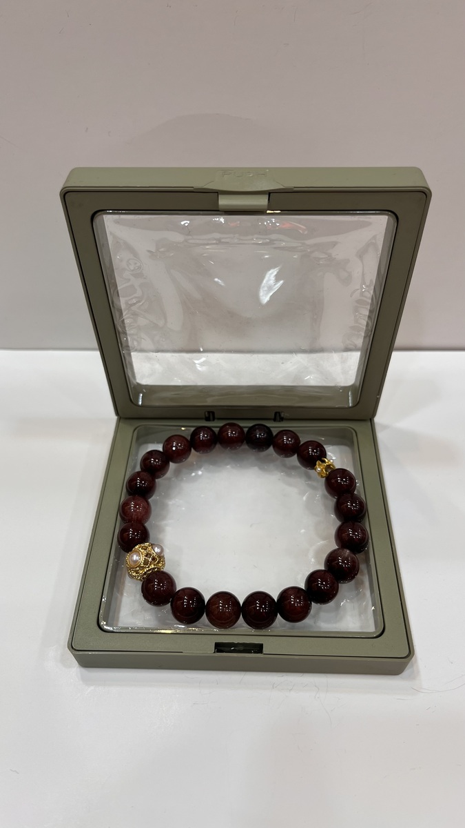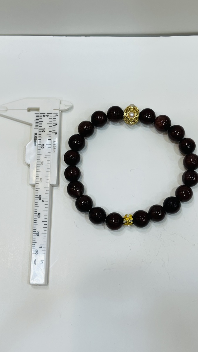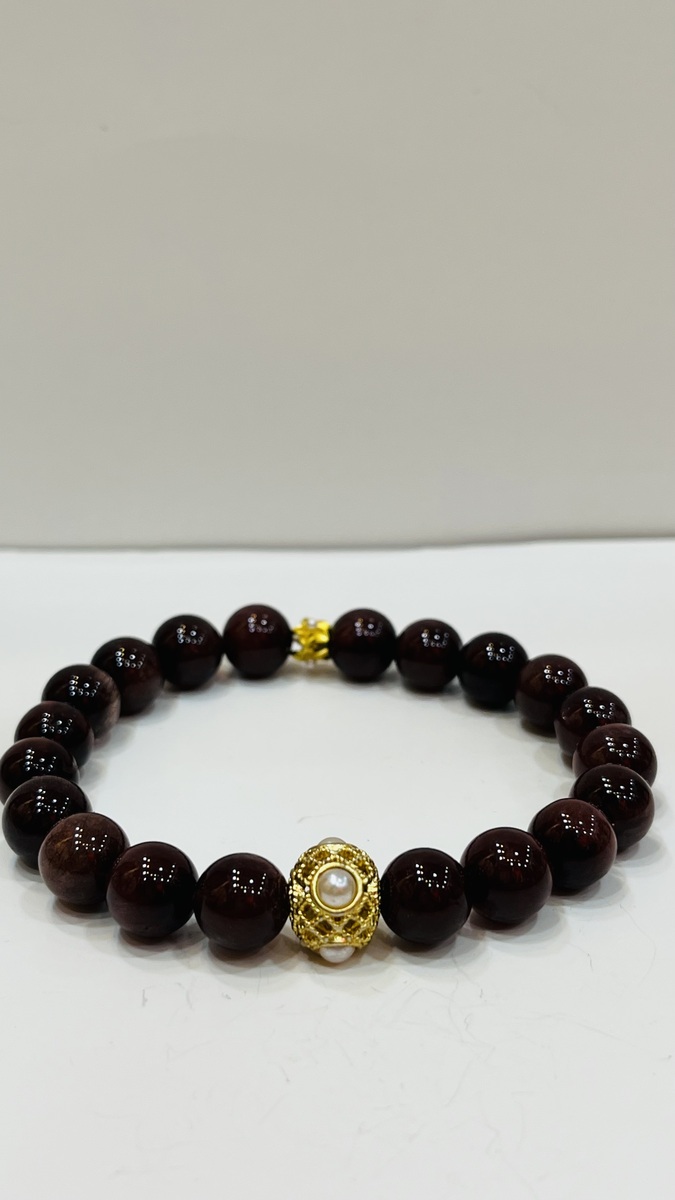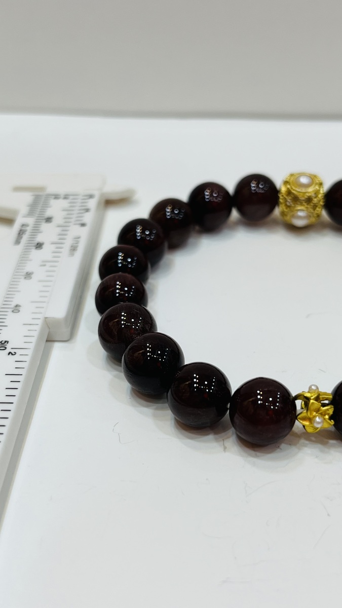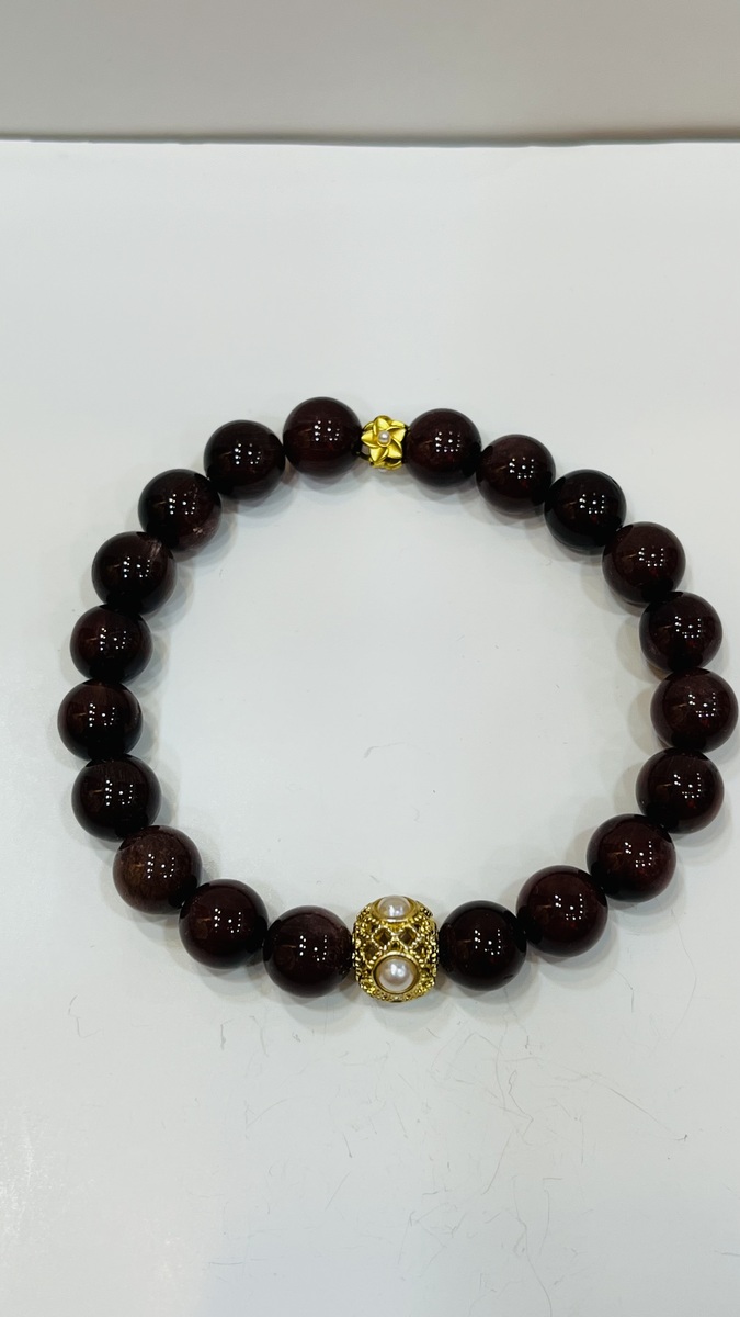 ? About This Bracelet A rich and luxurious bracelet featuring natural Red Rutilated Quartz round beads (10mm), deep wine-red in colour with a silky, glass-like finish. Accented by a gold-plated filigree bead with freshwater pearl centre — a single statement piece that elevates the whole design.