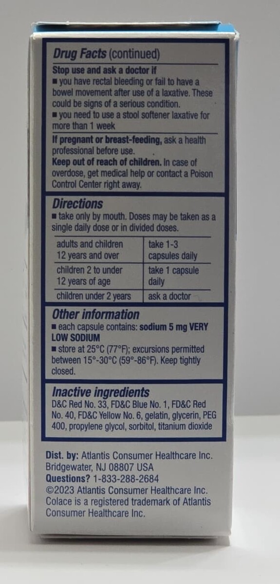 Colace Regular Strength Stool Softener capsules gently soften hard and painful stool for a number #2 that?s easy to do. Colace Capsules are the #1 Doctor recommended stool softener brand and have been trusted by doctors and patients for nearly 60 years to relieve occasional constipation. Gently softens stools: Colace Regular Strength Stool Softener relieves many symptoms of occasional constipation, including straining during bowel movements, hard dry stools infrequent or irregular bowel movements. Colace is not a stimulant laxative. The active ingredient, docusate sodium, allows water and fats to get into the stool, helping to soften and make passing it more comfortable. Adults and children 12 years and over take 1-3 capsules daily Children 2 to under 12 years of age take 1 capsule daily.