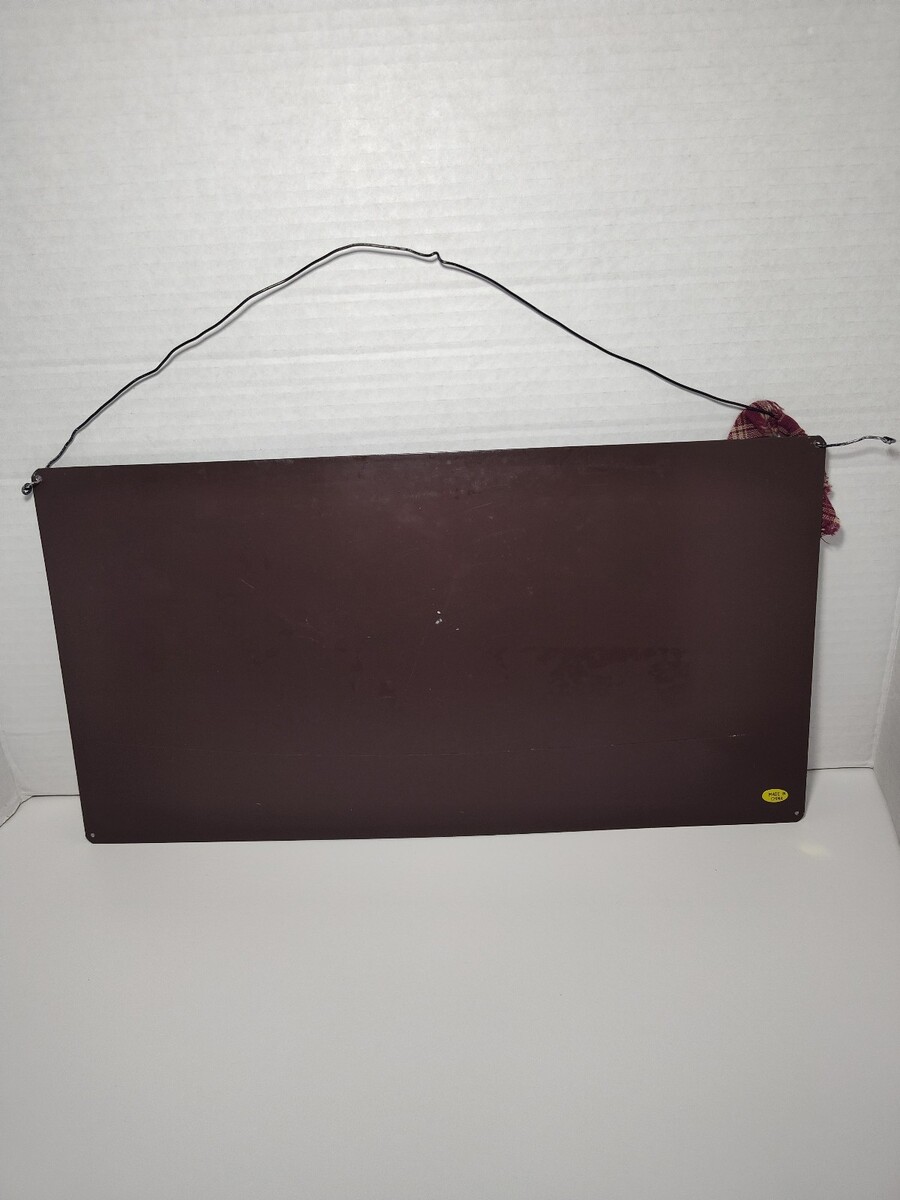Made of metal/tin with attached wire hanger and plaid bow accent.