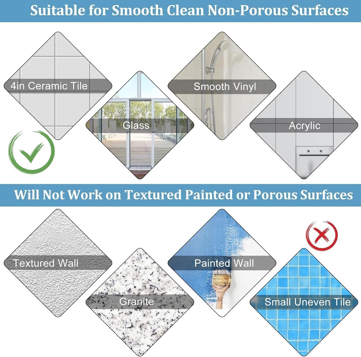 Important Note: Designed for non-porous, flat, smooth surfaces such as tile, glass, acrylic, and metal. Not suitable for porous surfaces or grout lines.