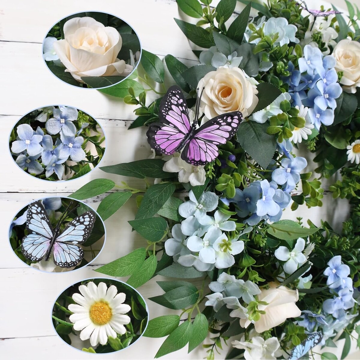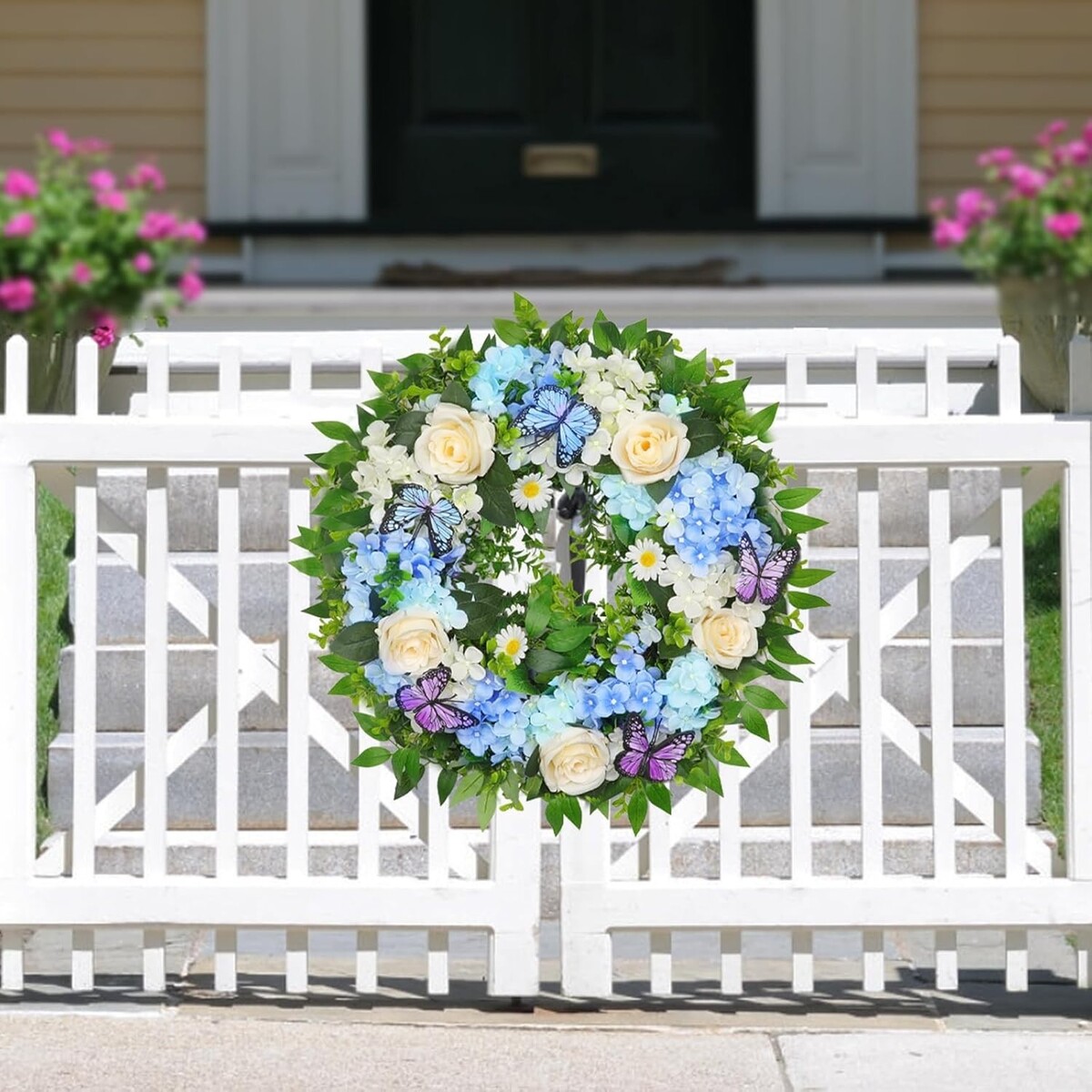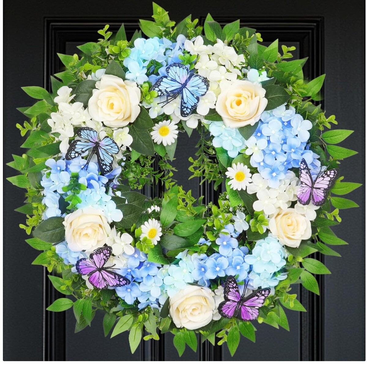 Invite the essence of nature into your home with this exquisite 24-inch Blue Hydrangea Wreath. Adorned with delicate butterflies, this spring wreath brings vibrant color and charm to your doorstep, front door, walls, windows, and garden.