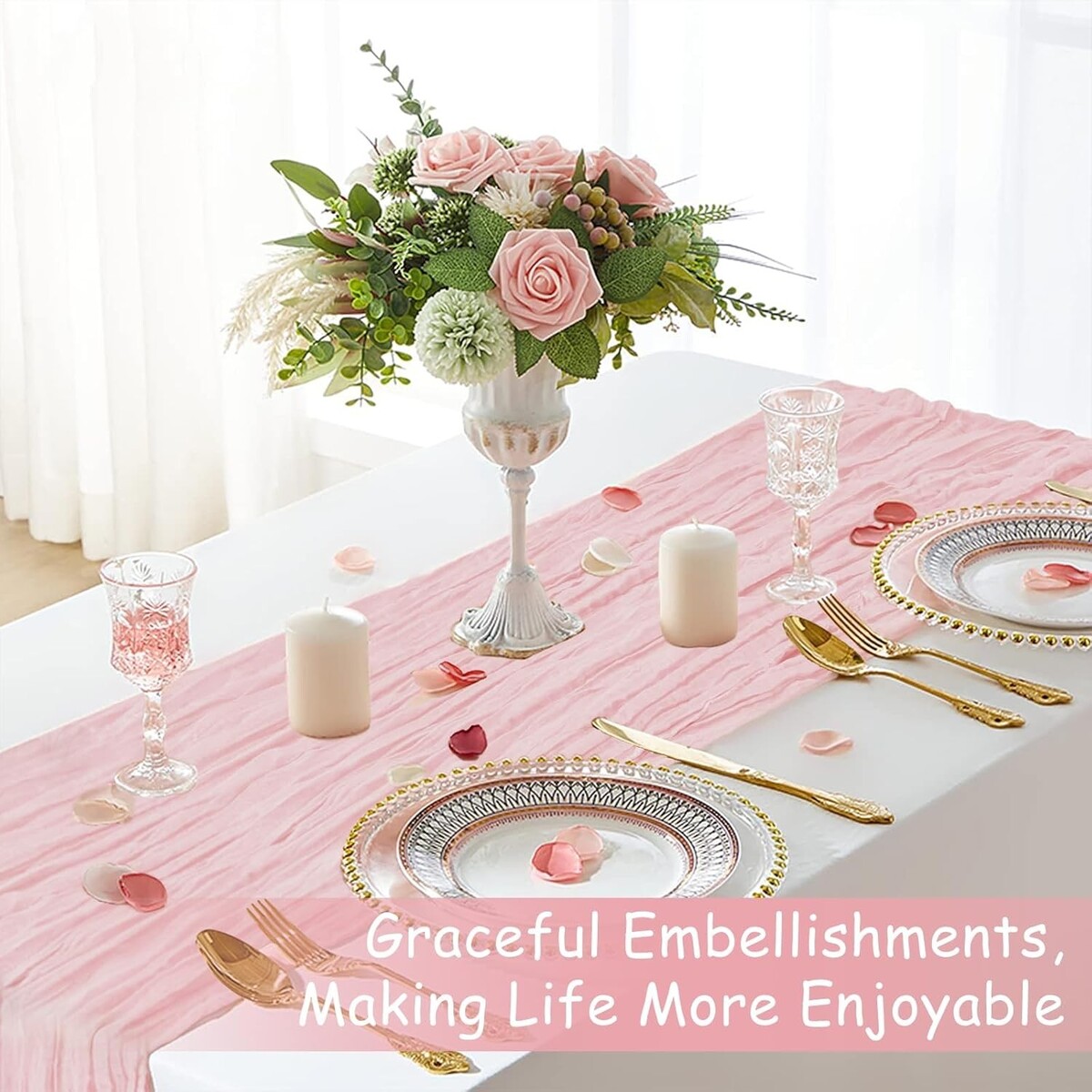 Unveil elegance at your dining table with our Soft Lightweight 10 FT Pink Cheesecloth Table Runner. Not only does it protect your tabletop and reduce wear and tear, but it also introduces a romantic flair that enhances any festive gathering. Made from skin-friendly cheese cloth, this table runner showcases a delicate texture and a visual depth that brings sophistication to your tabletop.