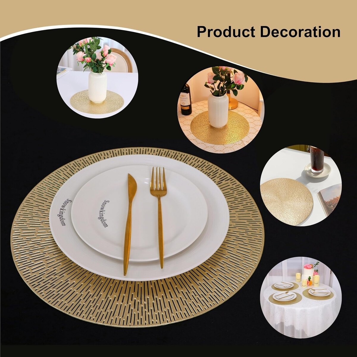 Centerpiece: Versatile and elegant, our gold placemats add a touch of sophistication to any home gathering. They can serve as stylish placemats or as decorative centerpieces for your table.