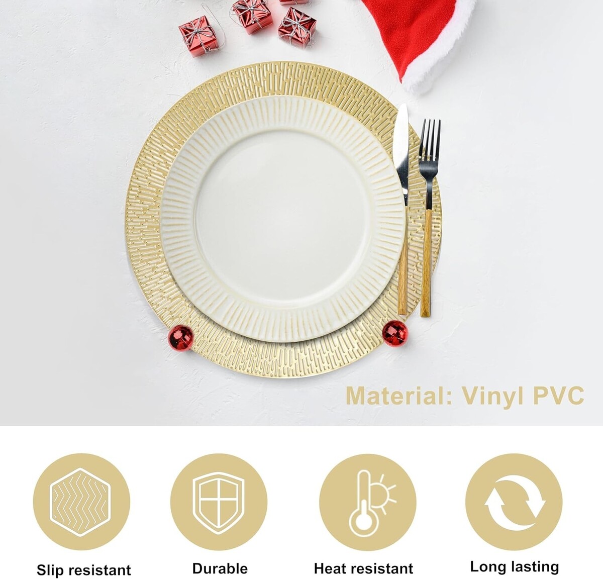 Durable Quality: Crafted from PVC vinyl, they offer exceptional durability and resilience. They shield your tabletop from scratches, stains, and heat, while also reducing noise from plates and cutlery.
