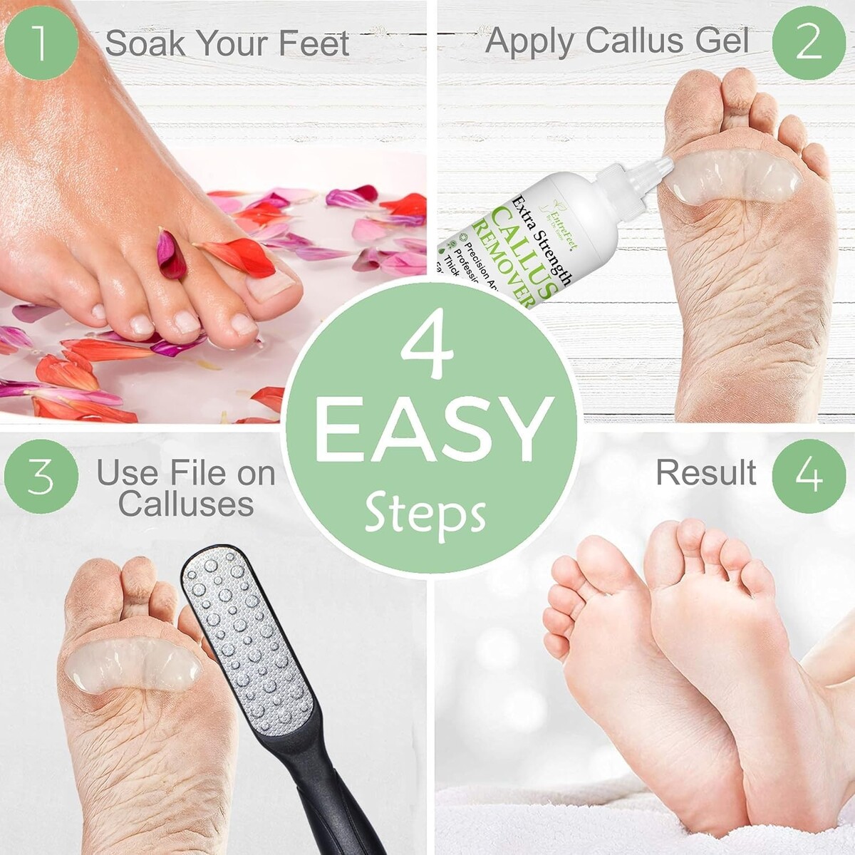 Indulge in the luxury of professional foot care right at home. Our 8 oz Extra Strength Callus Remover Gel paired with a double-sided file is not just a necessity; it?s an investment in your wellness. Follow the simple steps provided for salon-like results, combatting dry cracked heels, tough calluses, and rough corns in mere minutes. With our unlimited time frame guarantee, try it risk-free and embrace the transformation of your feet today!