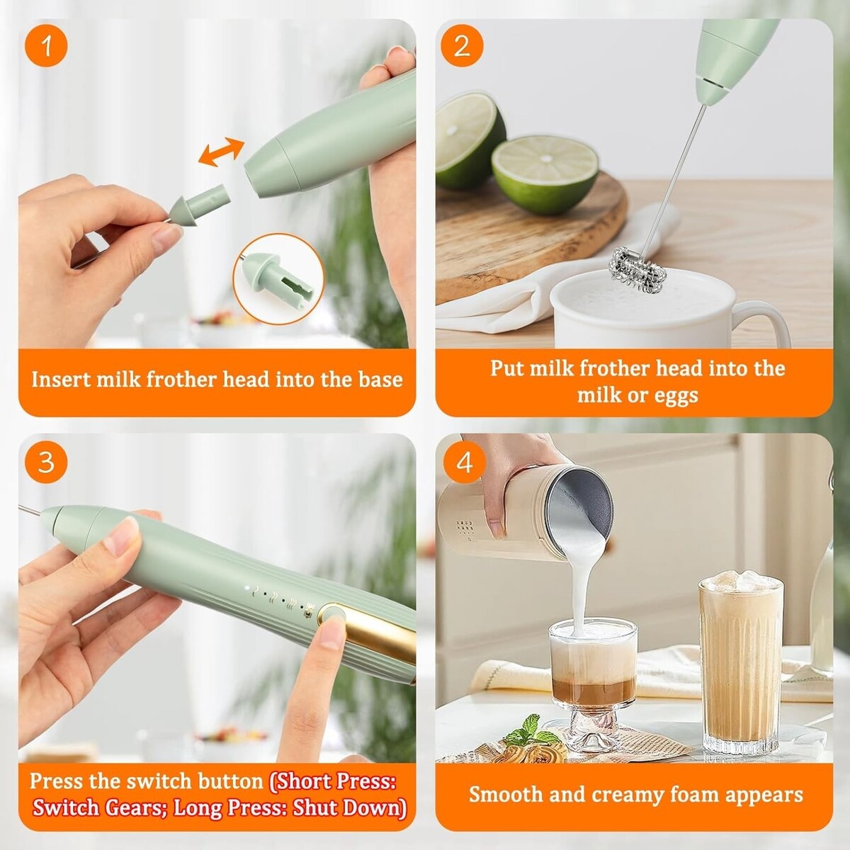 3-Speed Electric Hand Mixer Control: Customize your frothing experience with three selectable speeds (6000, 7000, 8000 RPM). This versatile electric whisk can whip delicate cream, prepare frothy coffee or mix drinks. Effortlessly switch off by pressing the button for 2-3 seconds, allowing you to craft the perfect texture with ease.