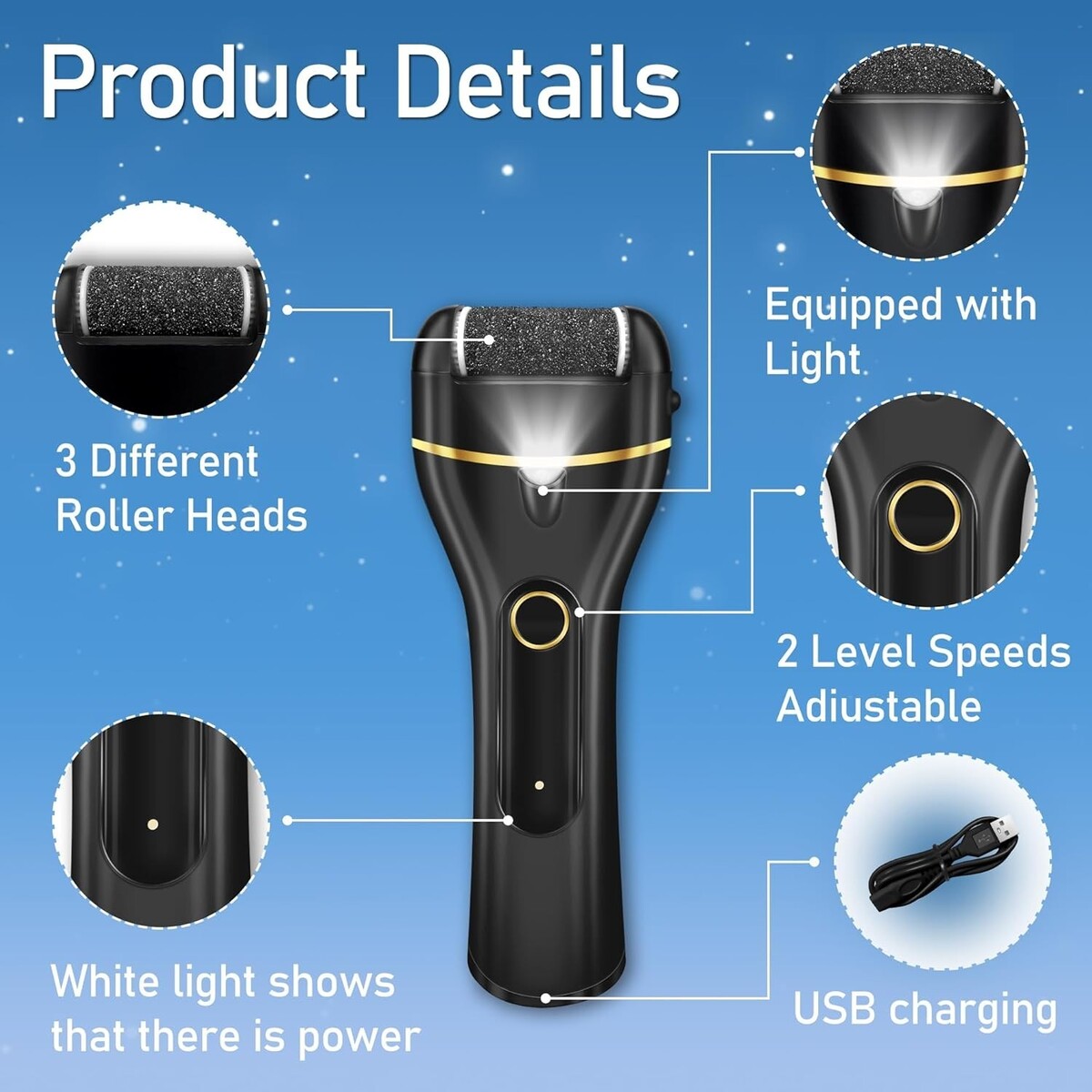 Equipped with three grinding heads: coarse for old calluses, medium for new dead skin, and fine for daily maintenance.