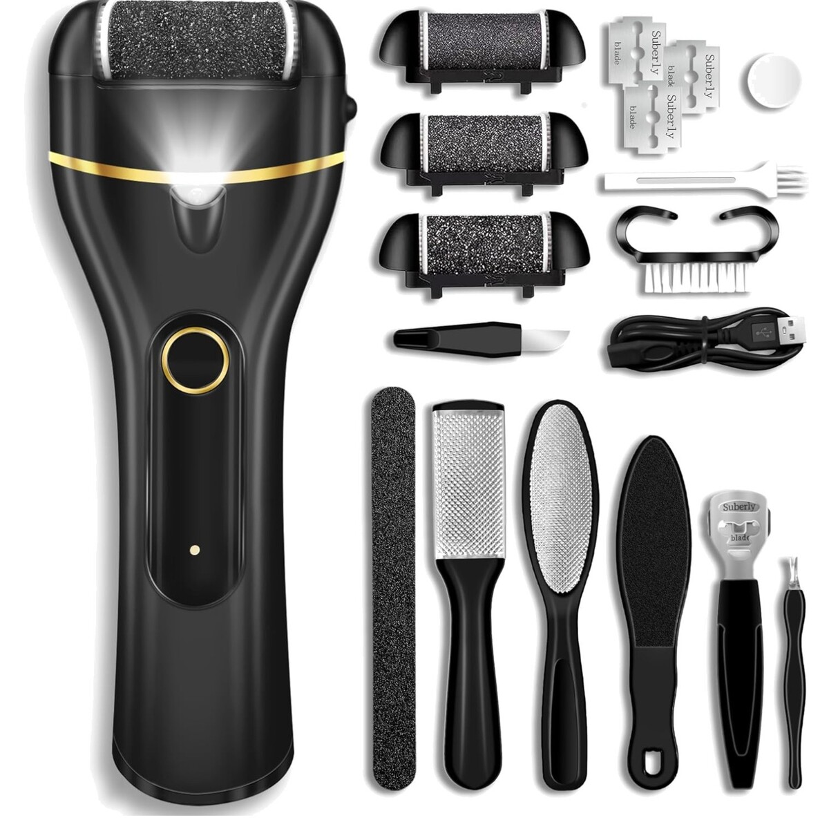 Set Includes: Callus Shaver,Foot Rasp,Nail File,Exfoliator,Charging Cable,3 Roller Heads,Cleaning Brush,Double-sided Frosted File,Foot Razor File,Foot File,Callus Remover,V-shaped Push Stick,Nail Brush
