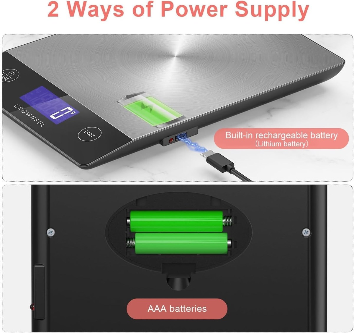 Power Supply: Versatile charging options with Type-C connector or 2 AAA batteries (USB cable and batteries included for your convenience).