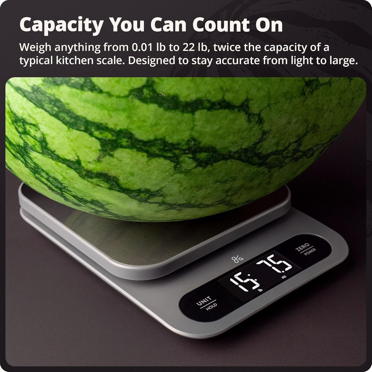 High-capacity kitchen scale measures up to 22 lb (10 kg) with precise 1 g increments.