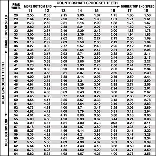 The gear ratio is ratio of teeth between front rear sprockets. This determines how engine RPM translates into wheel speed by bike. Changing sprocket sizes, front or rear, changes this ratio which changes the way bike puts power to the ground. With respect to stock gearing, installing a smaller front sprocket (fewer teeth), or a larger rear sprocket (more teeth), provides a lower gear ratio increasing acceleration of the bike but decreasing top speed. Conversely, installing a larger front or smaller rear provides a higher ratio which decreases the acceleration but increases top speed. Every one tooth change in the front is equal to a 3 tooth change in the rear. So a rear change more than two teeth means adding/removing chain links.