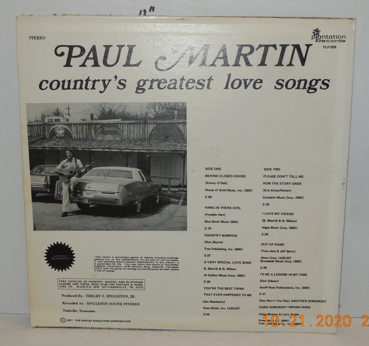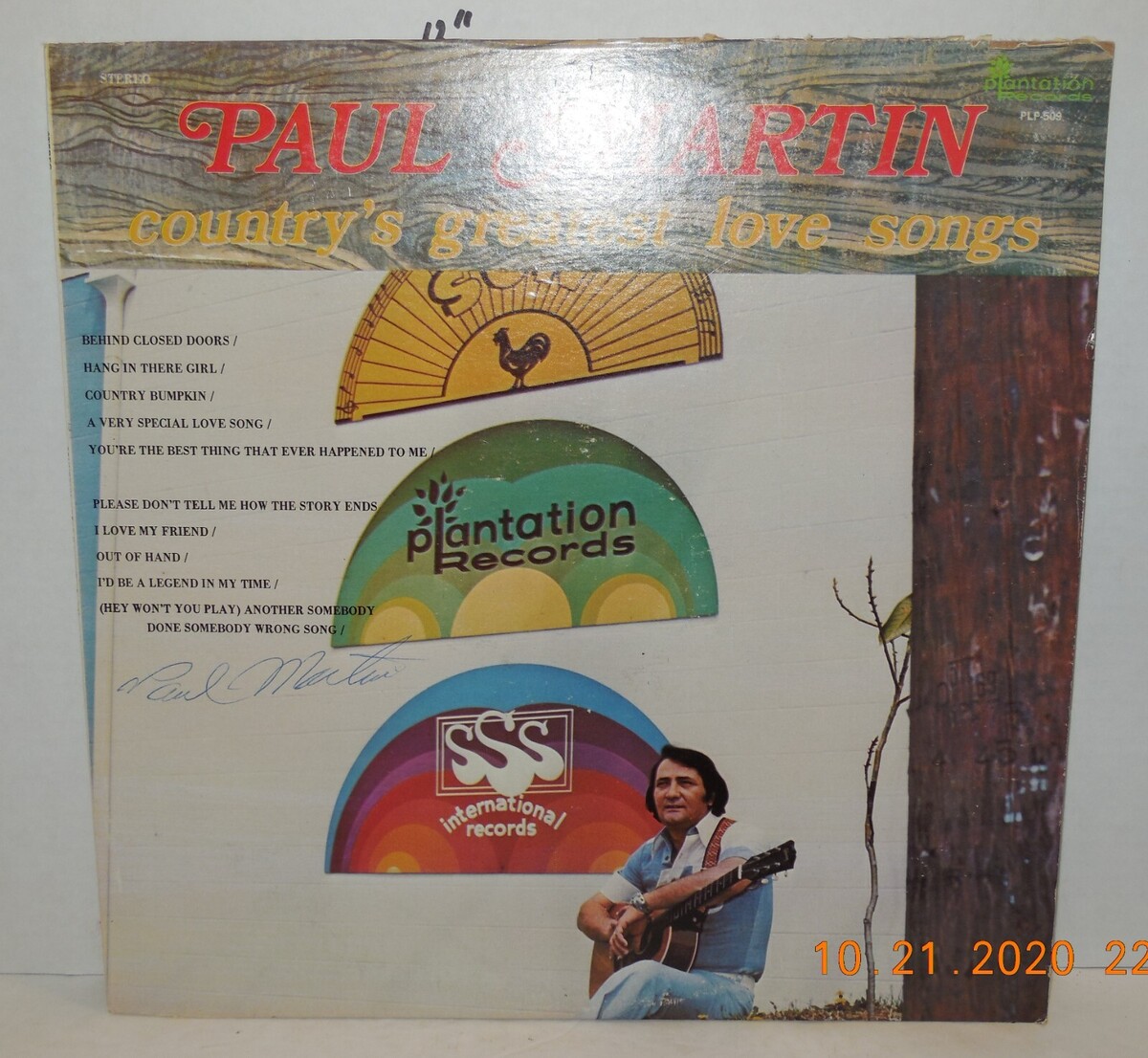 For Sale is a Paul Martin Country's Greatest Love Songs Record 1977 LP VG PLP-509 AUTOGRAPHED Signed Rare OOP. In VG to VG+ USED condition Has been play graded. comes as pictured. Please ask Any and All Questions prior to purchasing. Fast Same or Next day shipping with Free Delivery Confirmation within the U.S. Payment Due within 7 days of purchase (if you need more time please let us know In advance) we love to combine shipping is always a Yes and Most of the time Additional Items Ship for free.