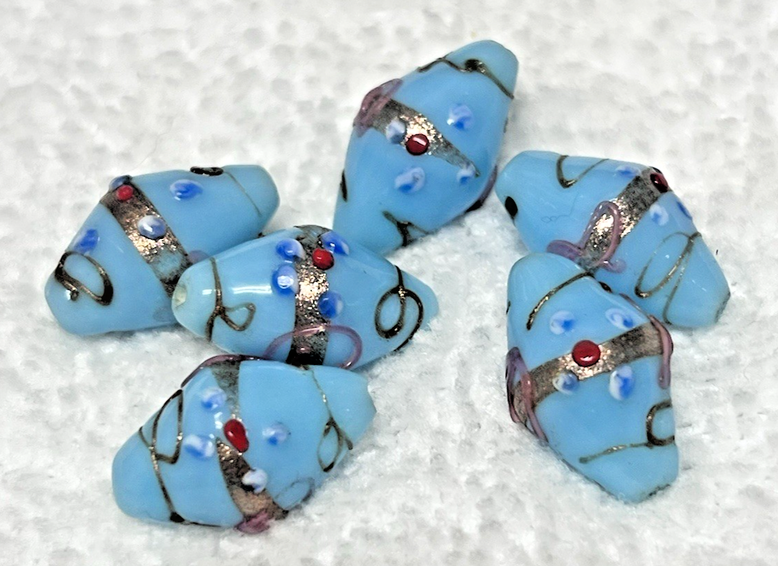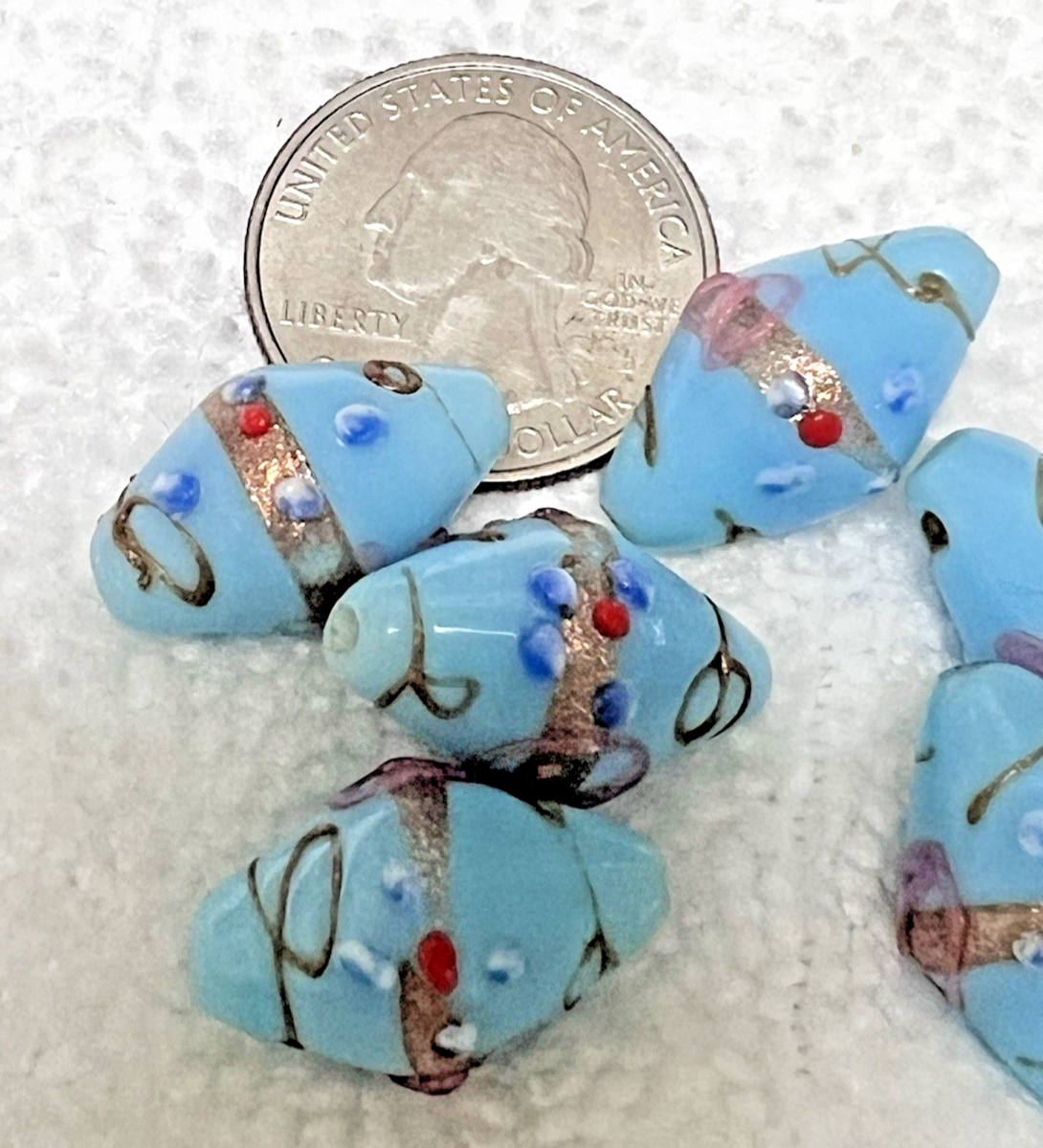 6 Vintage Art Glass Beads Robins Egg Blue Bicone Wedding Cake Style 3/4 x 1/2 In