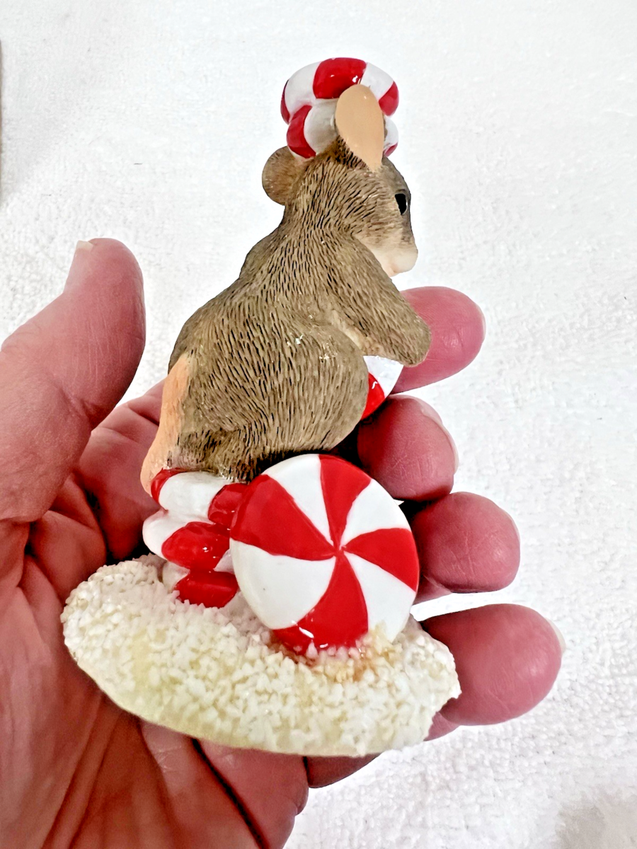 1998 Fitz Floyd Charming Tails Stack O Sweeties Candy Cane Mouse Figurine Box. Original box, Charming Tails Fitz and Floyd Christmas mouse holding red white swirled candy with holly accents figure measures approx. 3 3/4" tall. Very good condition, no damage, paint coloring very good, holly accents intact, and mouse is in great condition. See pictures.