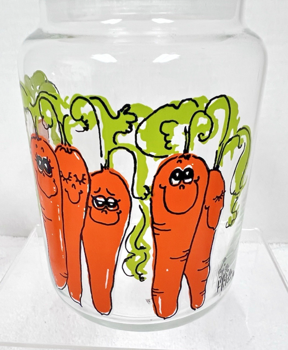 Vintage Hildi Anthropomorphic Happy Carrot Glass Canister Jar 7" Anchor Hocking In great shape the lid is not super dumper tight, but it does fit and seal we have others for sale with different vegetables and can combined shipping