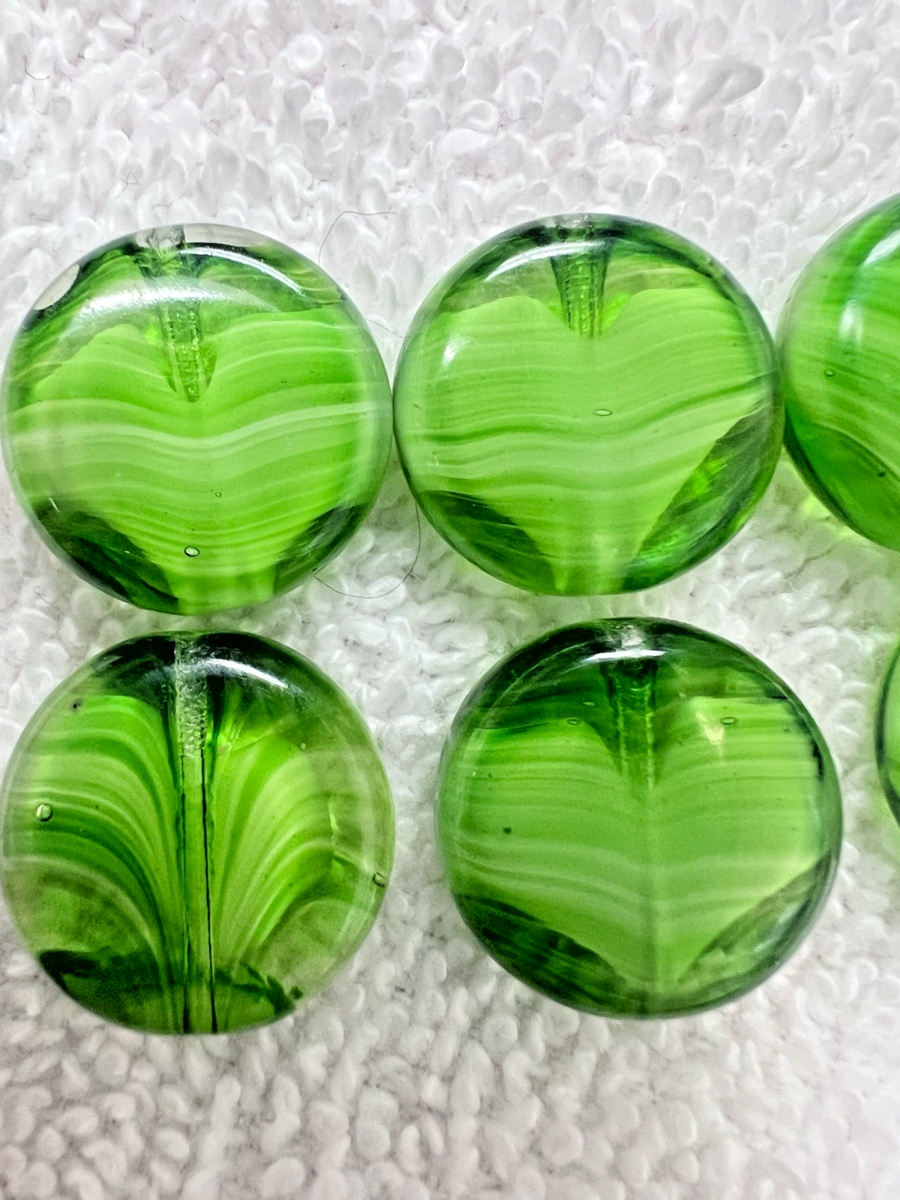 6 Vintage Handmade Art Glass Lampwork Beads Green w White Flat Rounds 3/4 x 1/4 some look like a heart with the white!