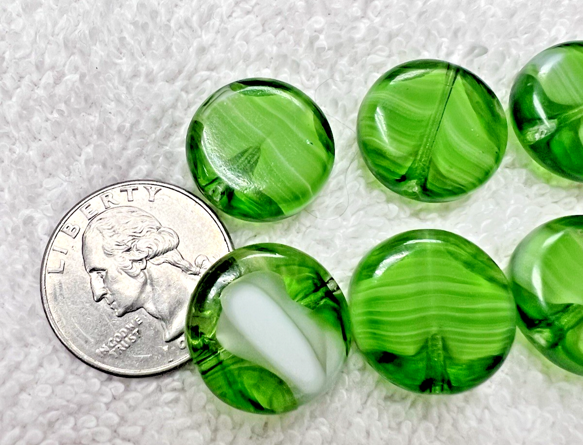6 Vintage Handmade Art Glass Lampwork Beads Green w White Flat Rounds 3/4 x 1/4