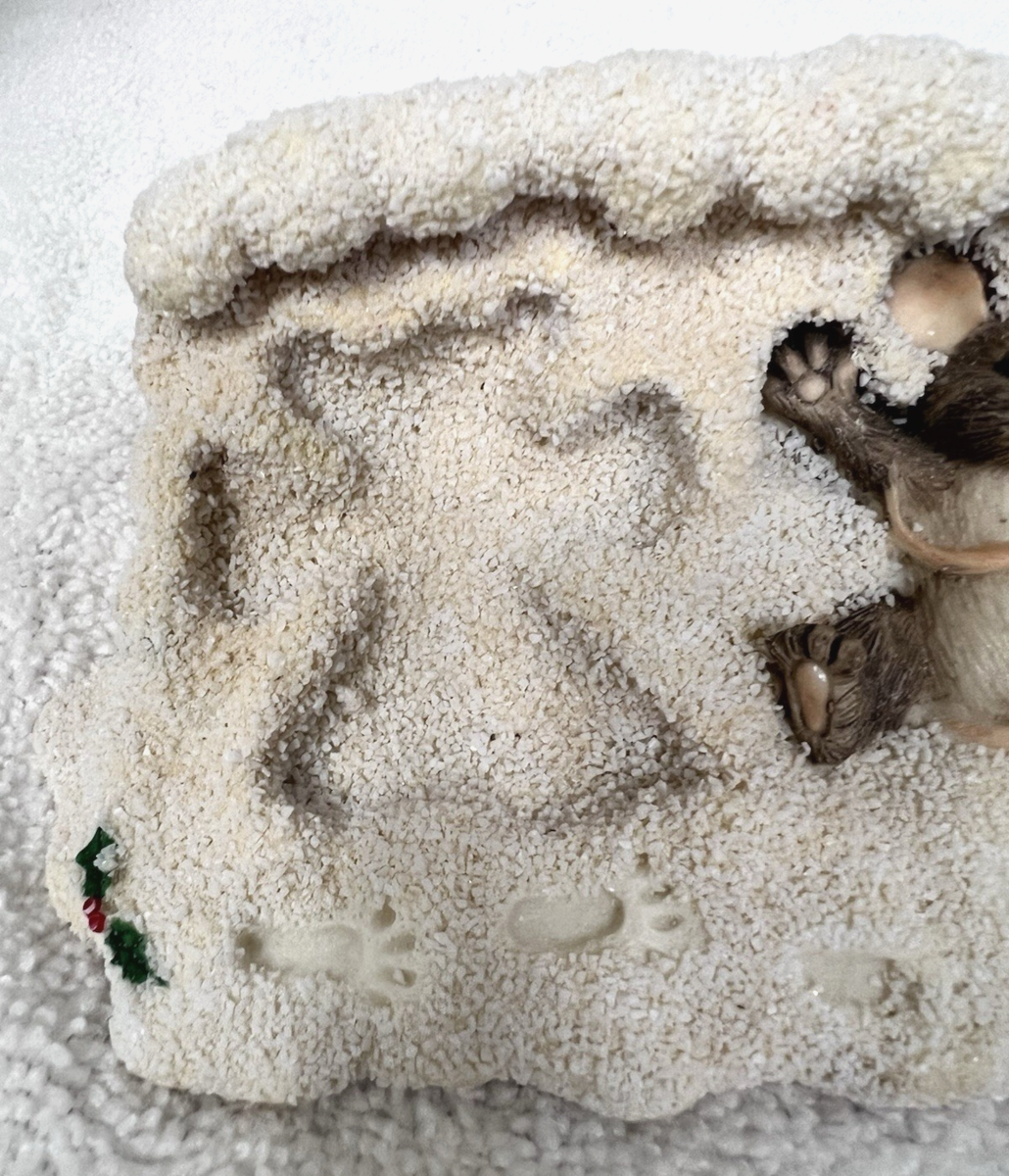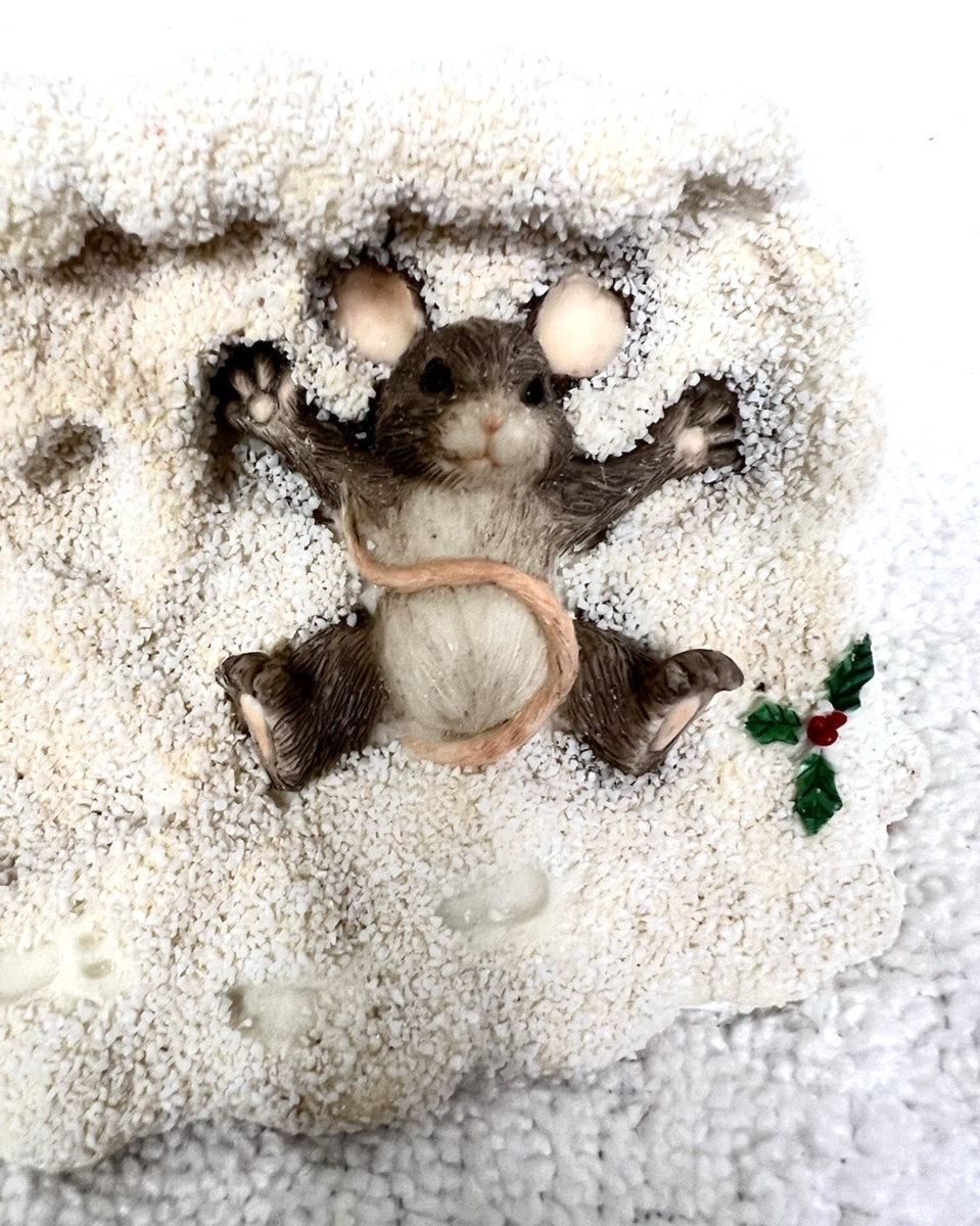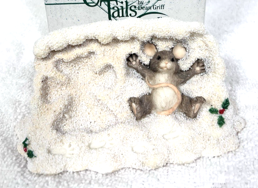 Silvestri Dean Griff Charming Tails Maxine Making Snow Angels Mouse Figurine Box. Original box, Charming Tails Christmas mouse lying in snow making an angel with holly accents figure measures approx. 2 1/2" tall, 5 5/8" long, and 2 3/4" wide. Very good condition, no damage, paint coloring snowflakes speckles intact and mouse is in great condition. See pictures.
