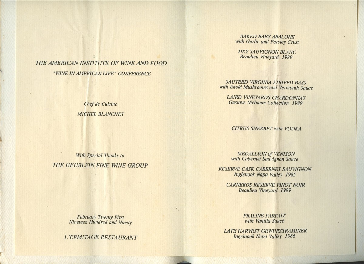 A 4 page The American Institute of Wine And Food , Wine in America Conference Menu. From Jean Bertranou's L'Ermitage Restaurant . L'Ermitage was located at 730 N La Cienega Boulevard in Los Angeles California. Measures about 6" x 9" when closed