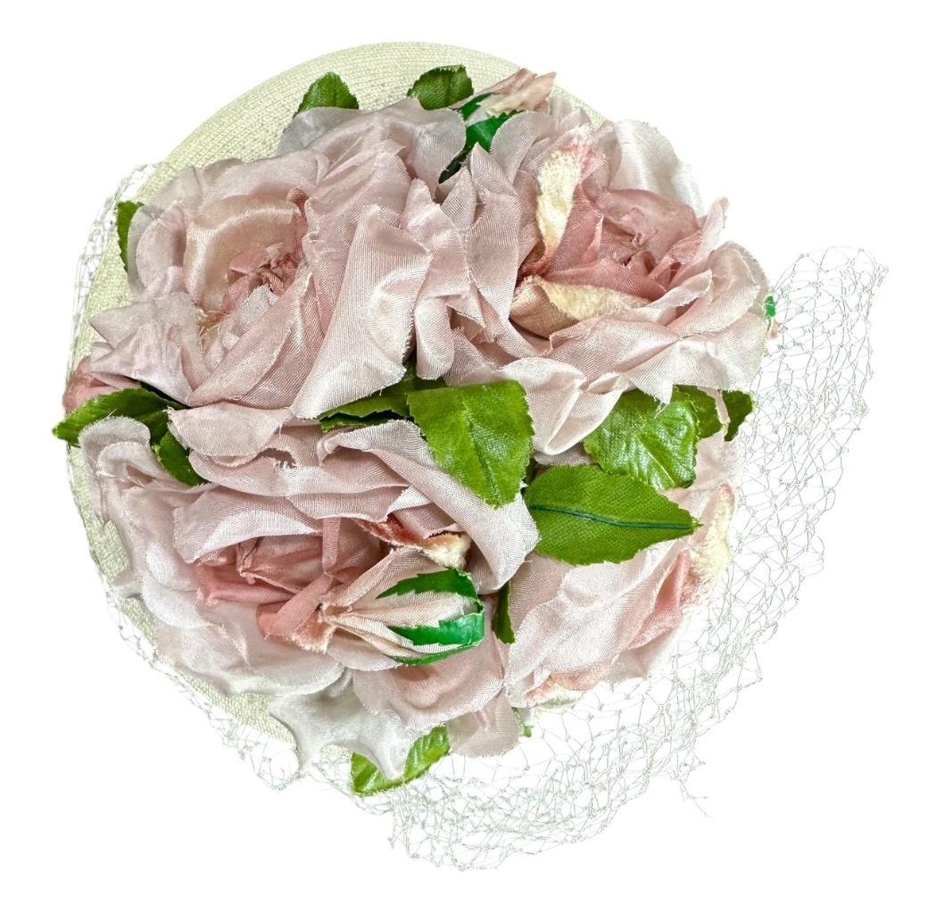 Beautiful Vintage White Straw Circular Hat Trimmed With Pink Roses Circa 1947 Previously owned and remains in good condition for its age but there are some rips in the net Comes as shown