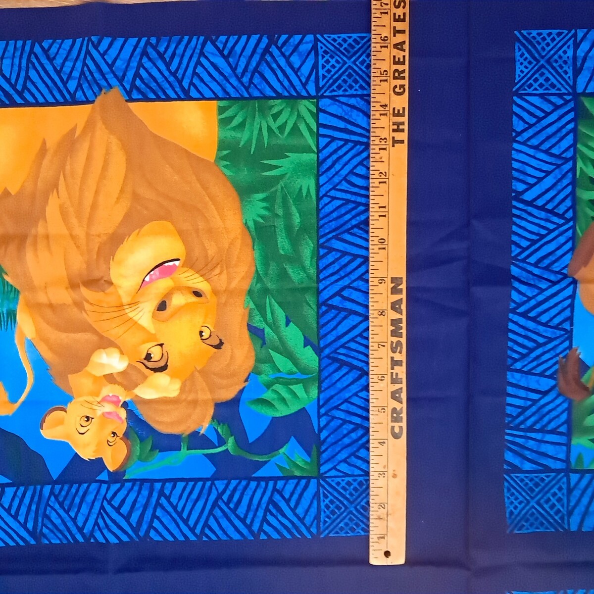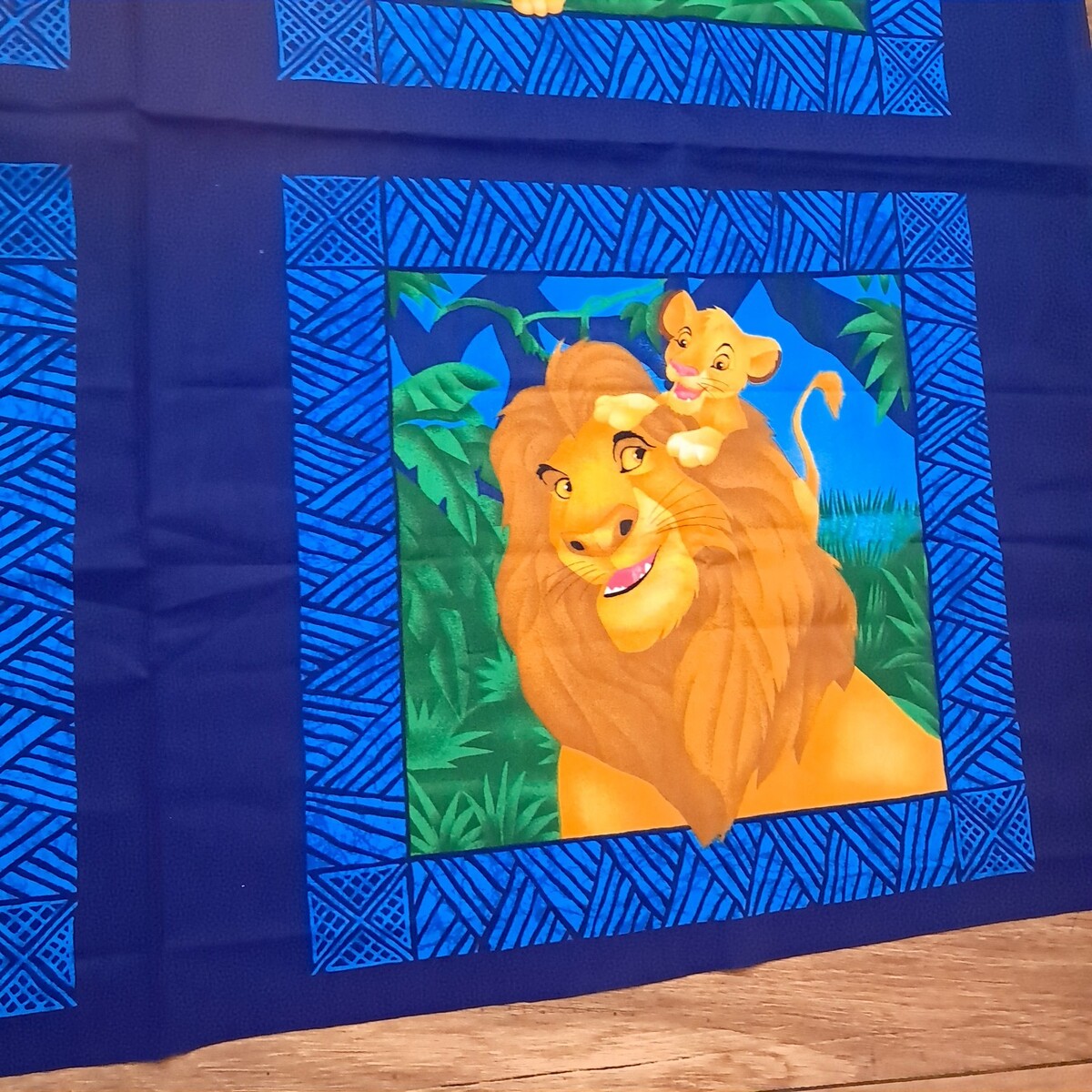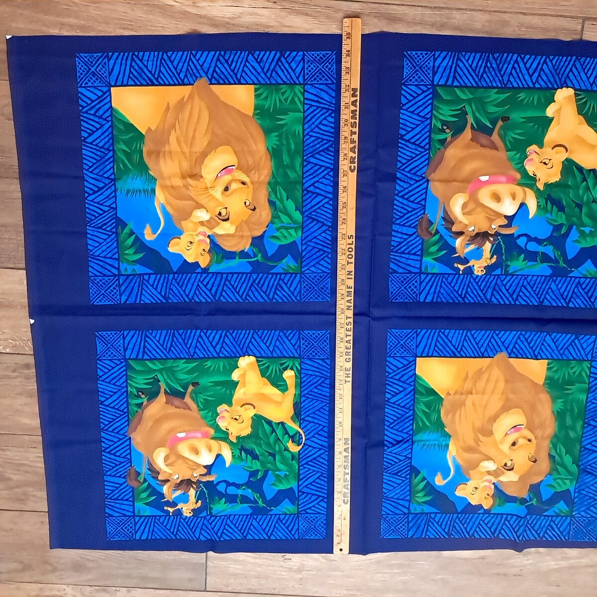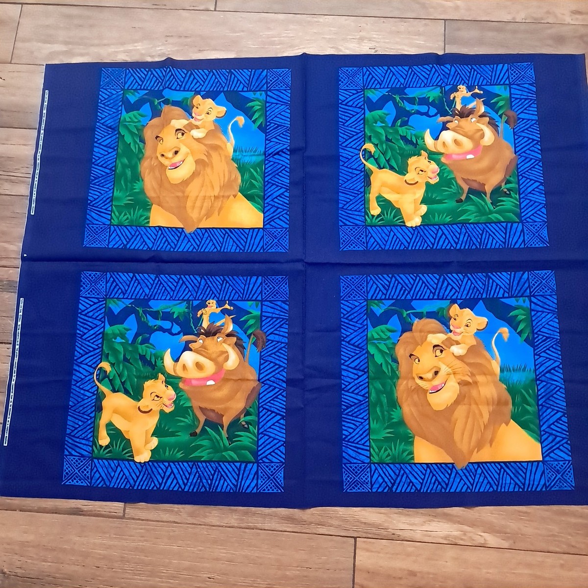 Uncut panel section. Great for making pillows. Features Mufasa and Simba on two panels and Simba, Timon and Pumba on the others.