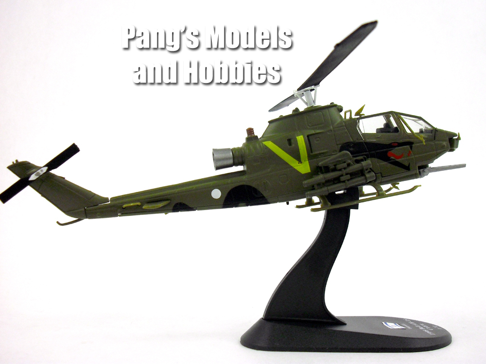This Cobra model is a twin seat model and does not include a pilot/crew figures. The cockpit can not open. Attached to the wings are a variety of rockets and missiles. A stand where the model can be attached for display is included. The display stand has the model's info such as country, flag and scale.