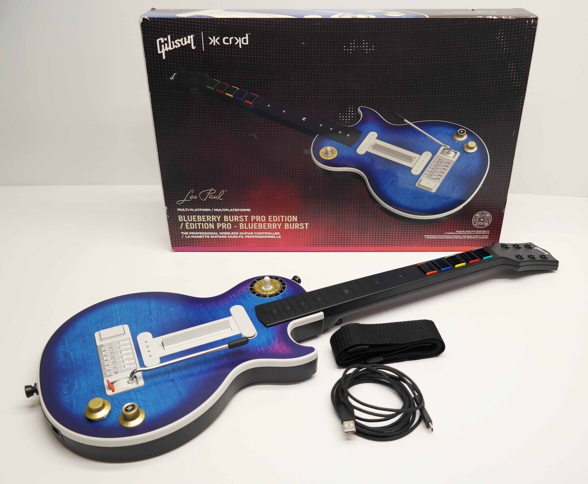 Description: Includes Retail Packaging, Gibson Les Paul Guitar Controller Body, Pro Fret Neck, Wireless USB Dongle, USB-C Charging Cable, Removable Rechargeable Battery and Black Shoulder Strap.