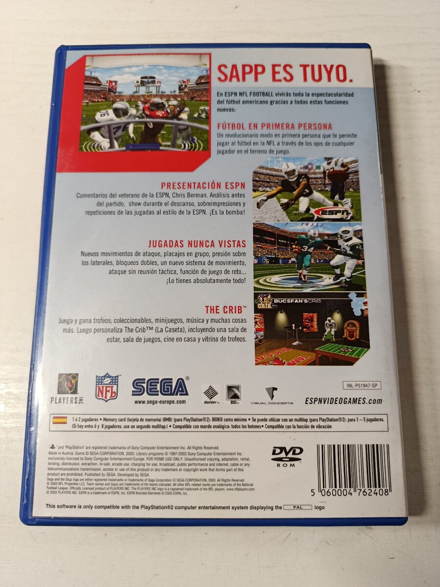 ESPN NFL Football PS2, juego sportivo PS2, SEGA 2K4 PS2, football americano PS2, collezione sportiva PS2, giochi retro PS2, juego PAL per Playstation 2, NFL 2K PS2, The Crib SEGA, Visual Concepts PS2