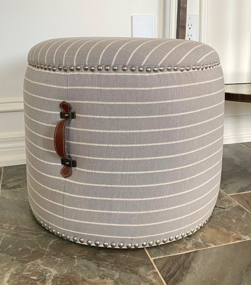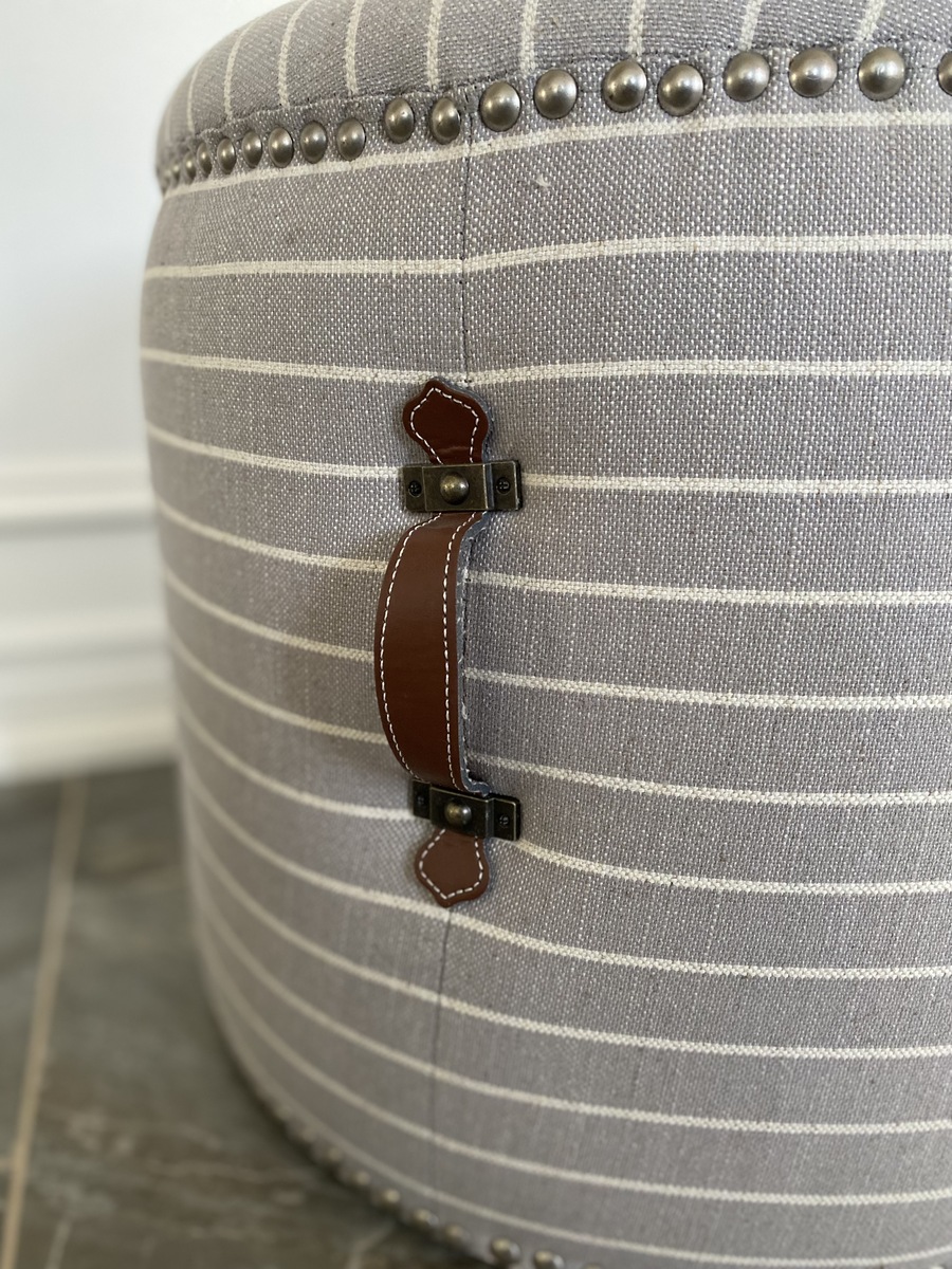 A round shape ottoman is designed with upholstering of high end Azure blue or Grey ticking linen blend fabric.