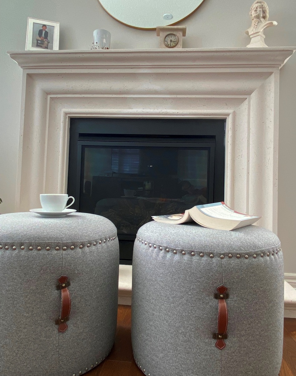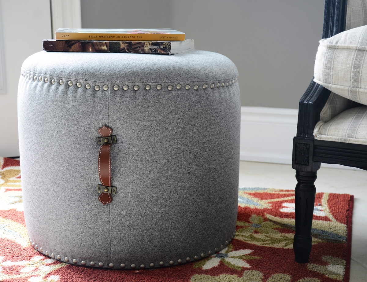 A round shape ottoman is designed with upholstered fabric in Light Grey, Beige or Charcoal Grey, Light Blue assorted colors.