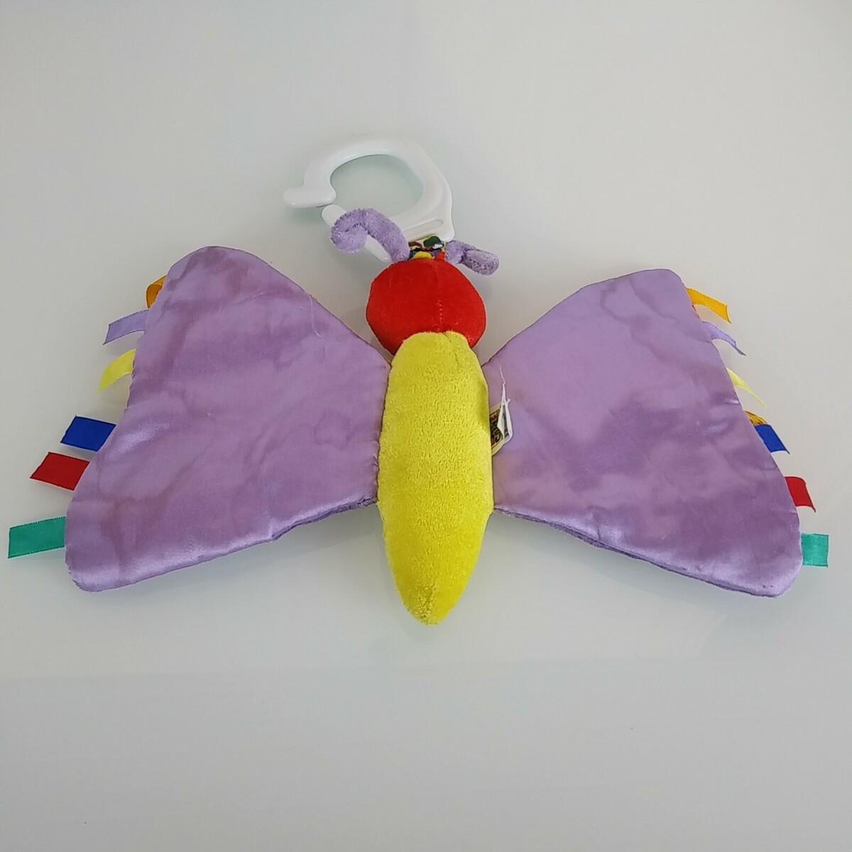 11" wide, 6" tall. Used. No rips, stains, holes, tears, or offensive odors. Soft stuffed plush ring link clip on toy, features crinkle wings, mirror, teether flower, and satin ribbon tags for baby to explore. It rattles. . From a clean, non-smoking and pet-free home.