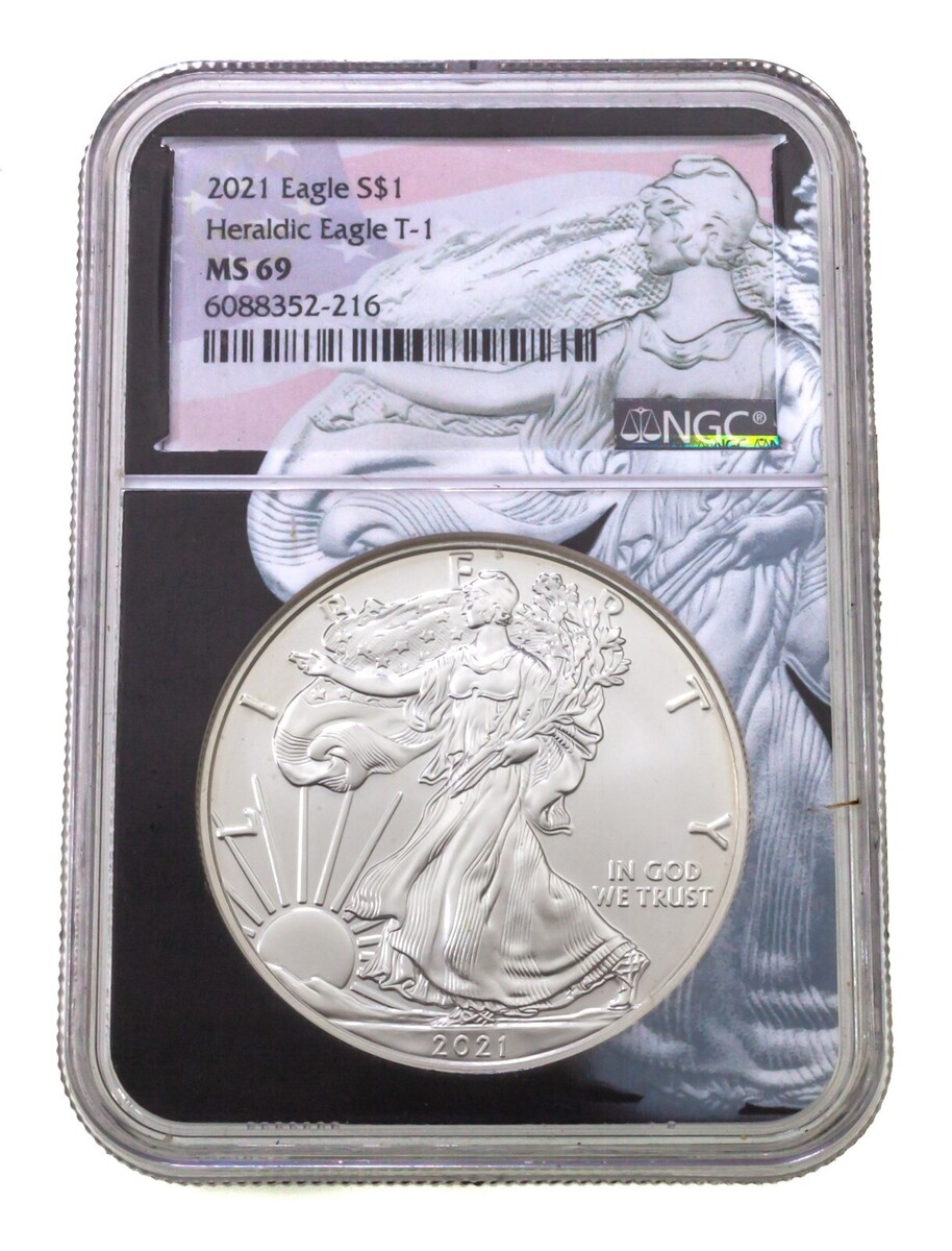 2021 S$1 Silver American Eagle Valutato Da NGC Come MS69 Aquila Araldica T-1