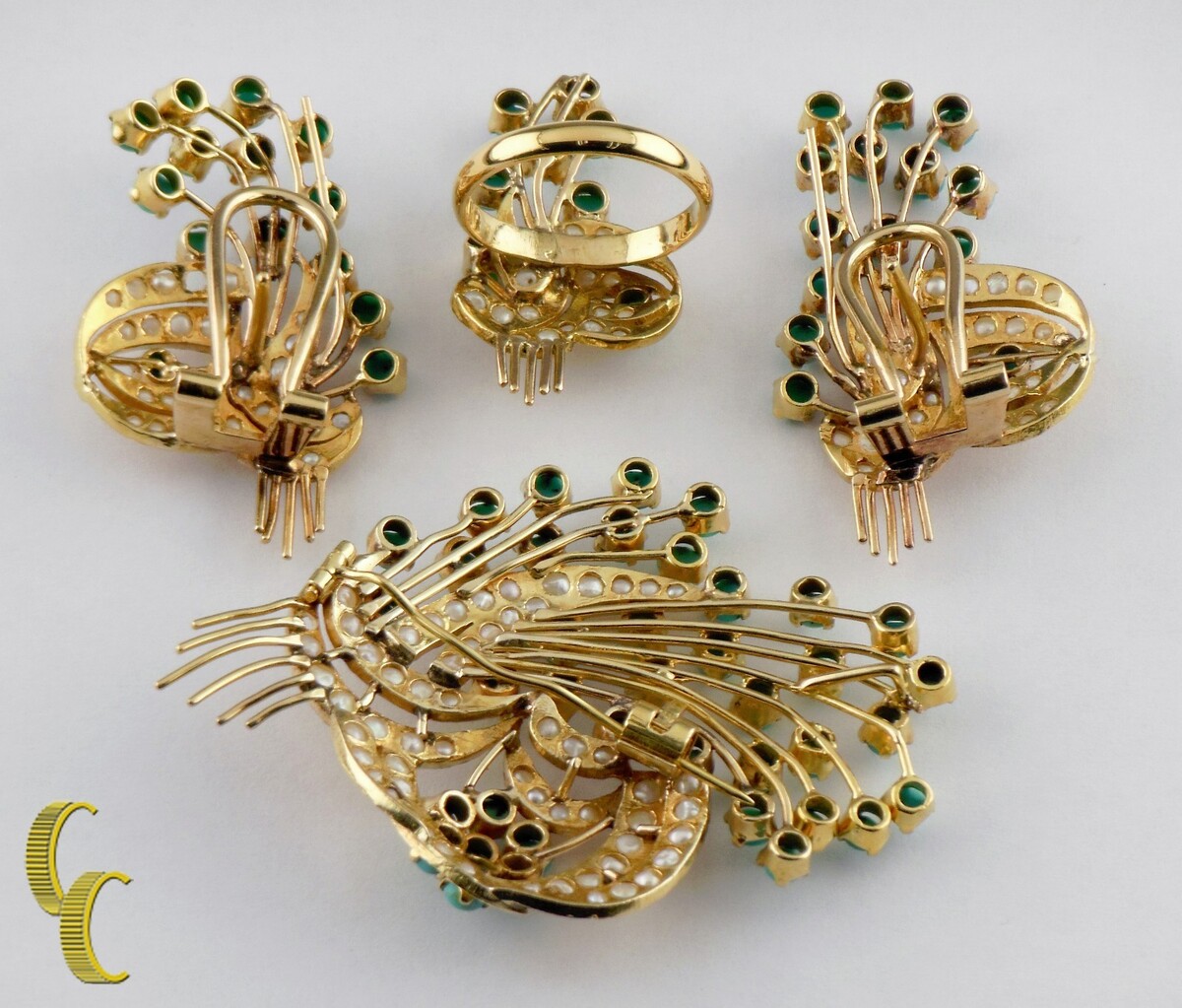 Set of 18k Gold Earrings, Brooch, Ring Sz 6.5 set w/ Pearl Turquiose Cabochons