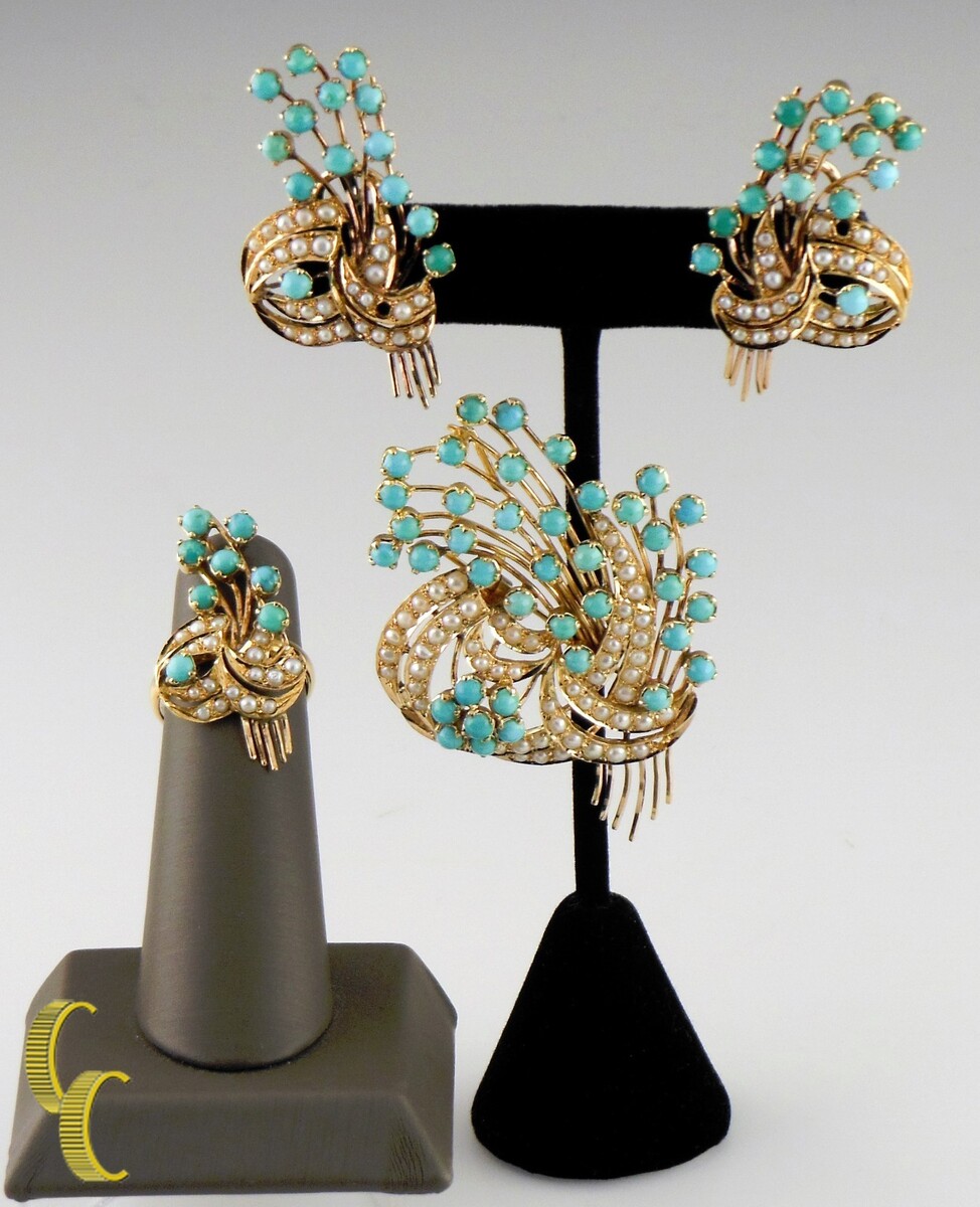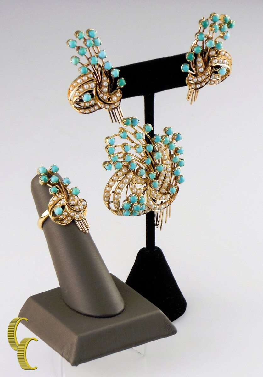 Gorgeous Set of Earrings, Brooch, and Ring w/ Fan-Like Designs Set with Turquoise and Pearl Cabochons